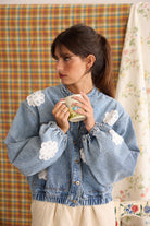 This short, voluminous bomber jacket, with pockets and floral appliqués, inspired by the doilies from grandmothers' houses, is the perfect blend of modernity and craftsmanship.