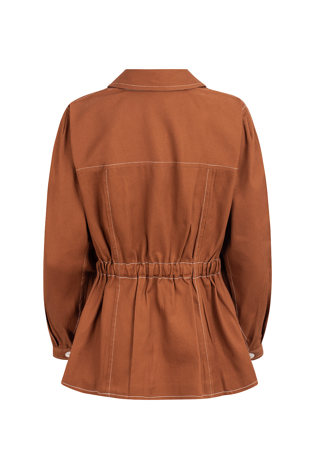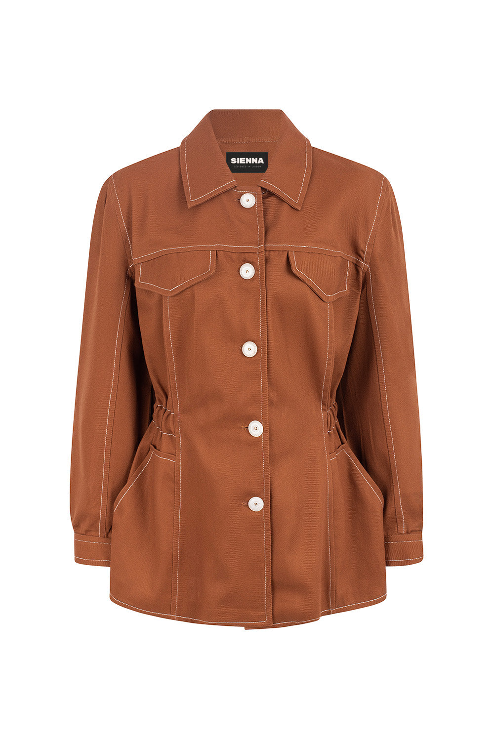 Meet our new highly detailed jacket with collar and buttons, balloon sleeves, patch pockets and elastic on the waist. It also has contrasting white seams, giving it a sofisticated yet casual flair. Complete your workwear inspired look with our matching pants and skirt, or with some jeans and flats.