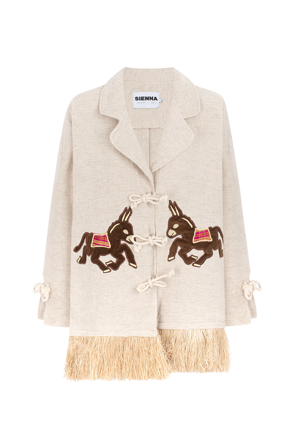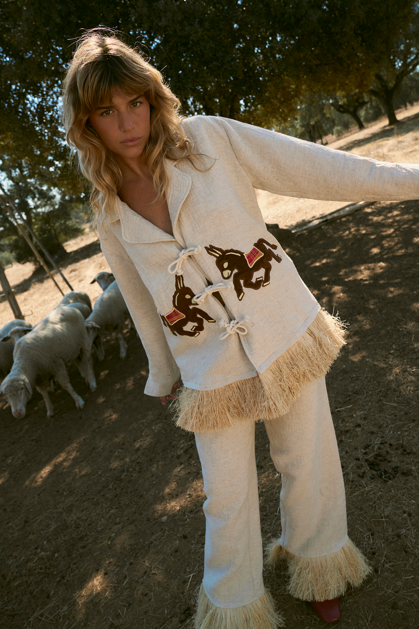 Two embroidered donkeys recall the simple life of the countryside, with the straw hem adding authenticity, as do the ties for closure. A truly handmade and unique piece, one of our favorites from the drop.