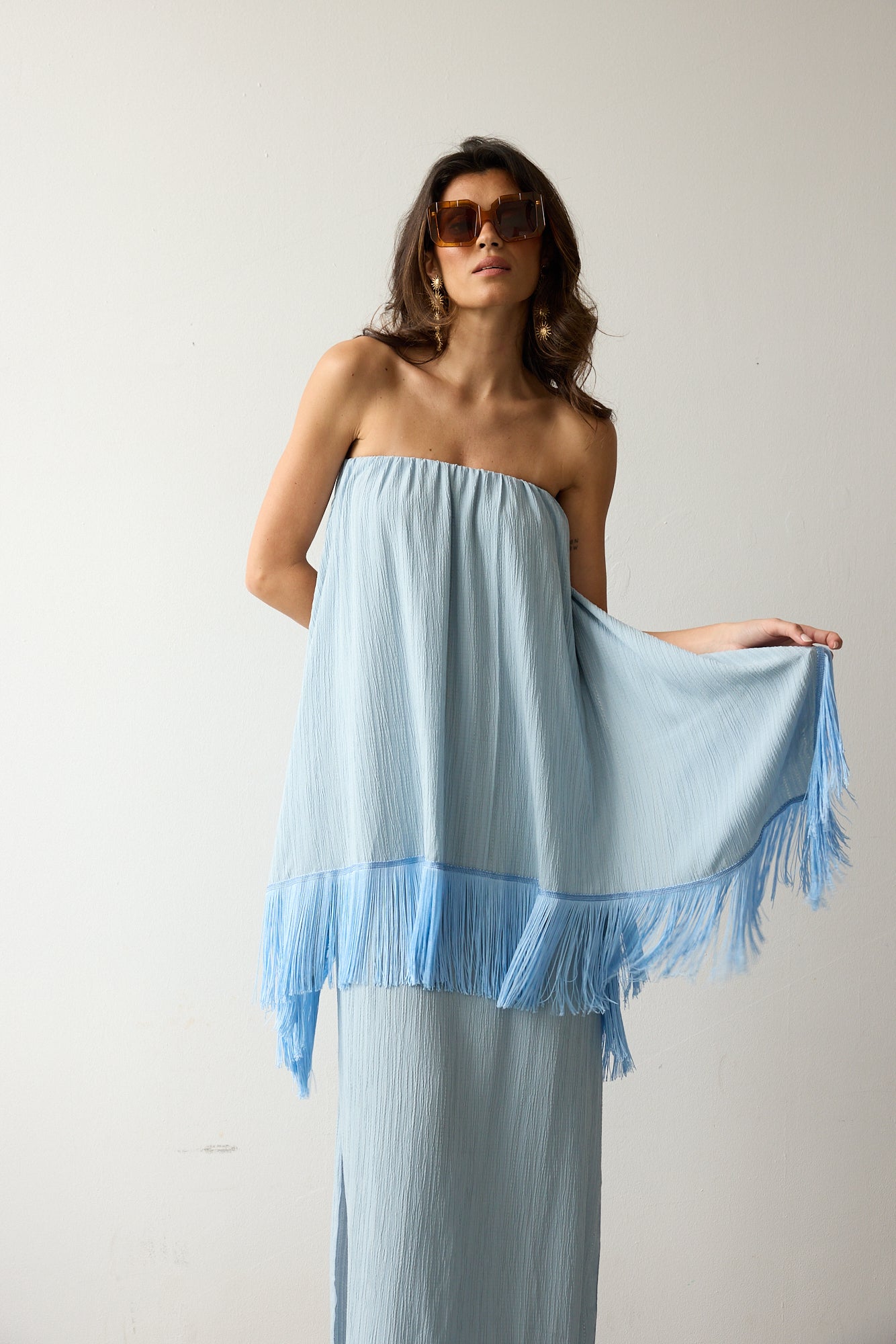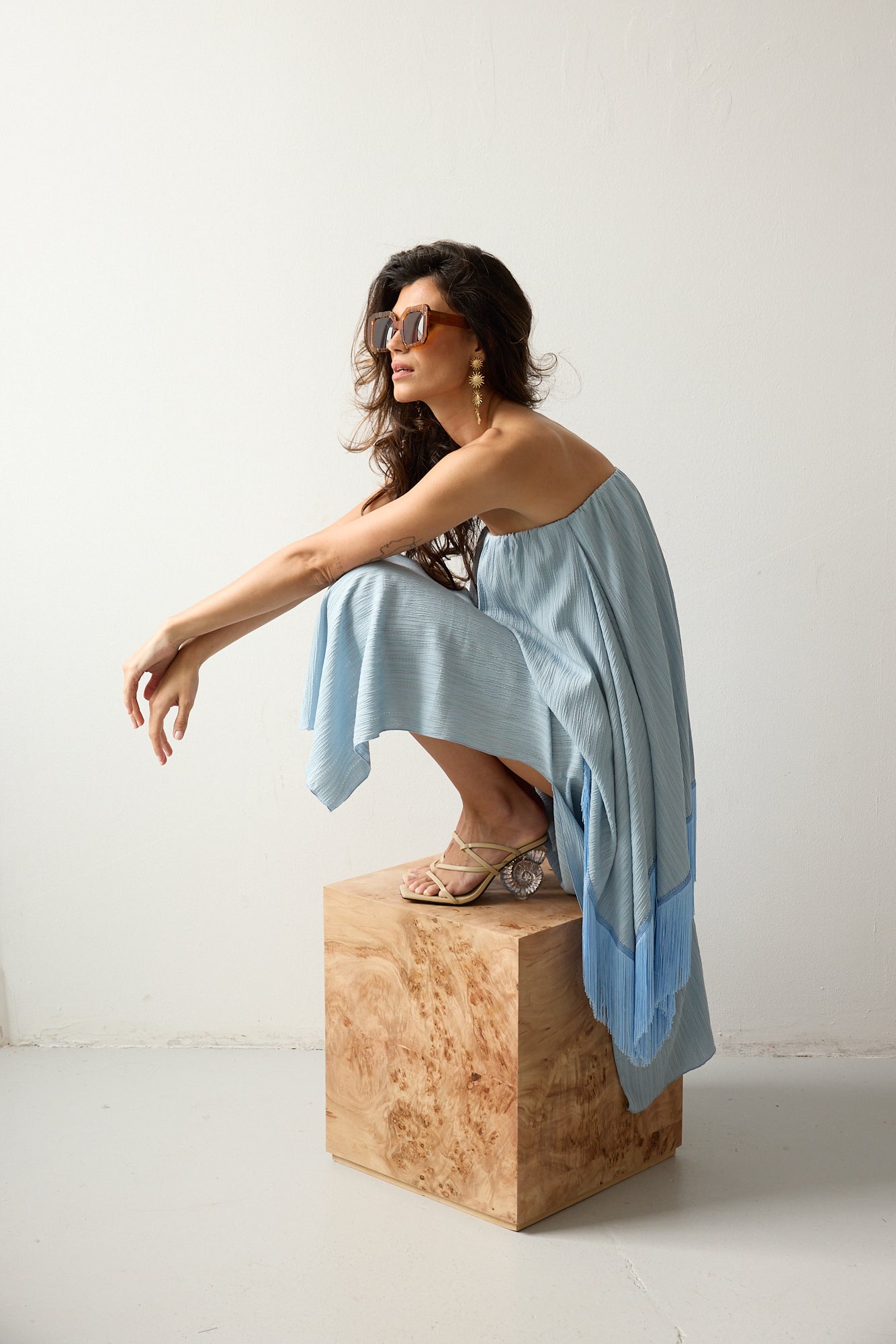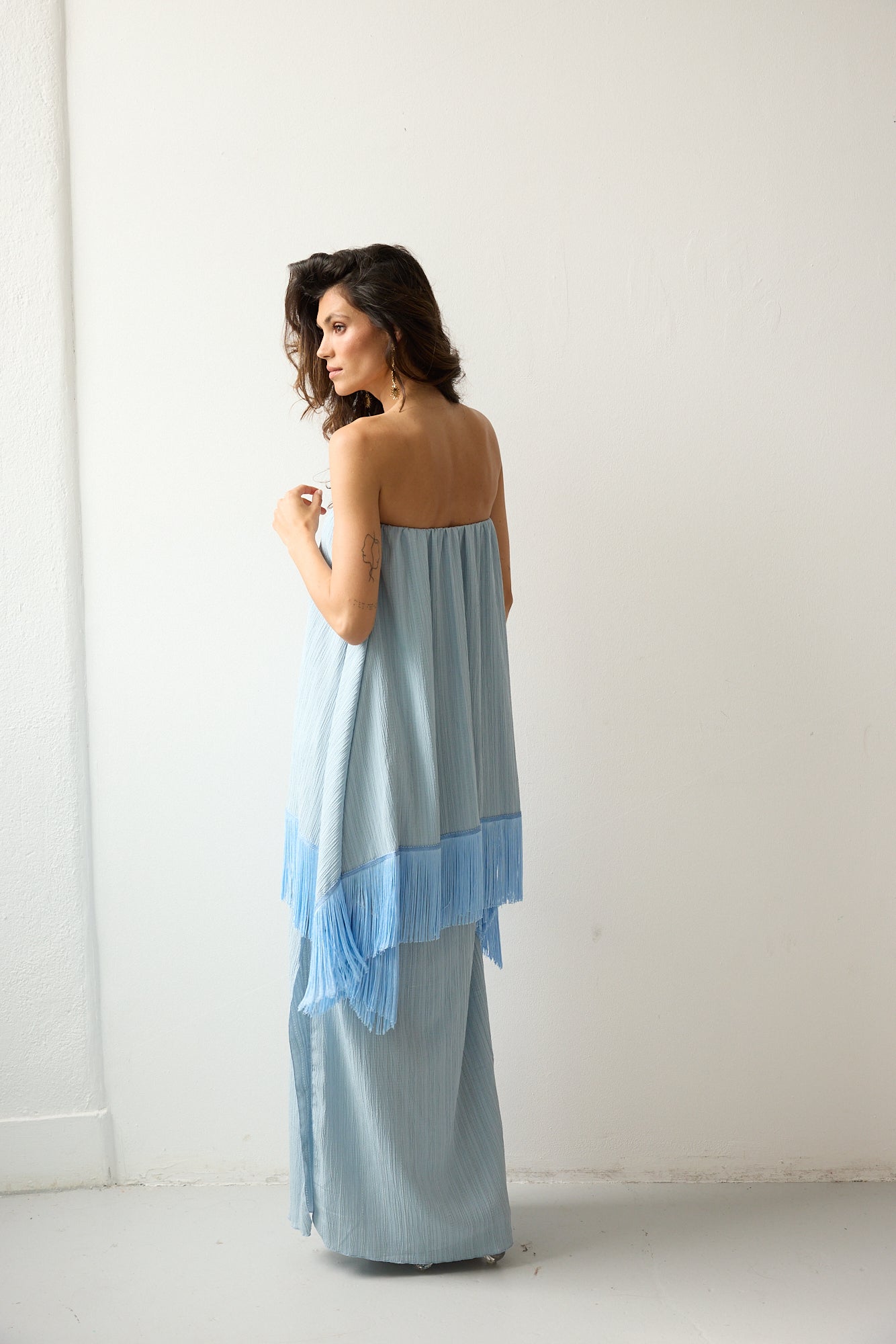 Este elegante vestido sem alças tem uma silhueta fluída e detalhes de franjas ao longo da bainha, adicionando um toque divertido a qualquer ocasião. Perfeito para todas as celebrações desta Primavera-Verão.