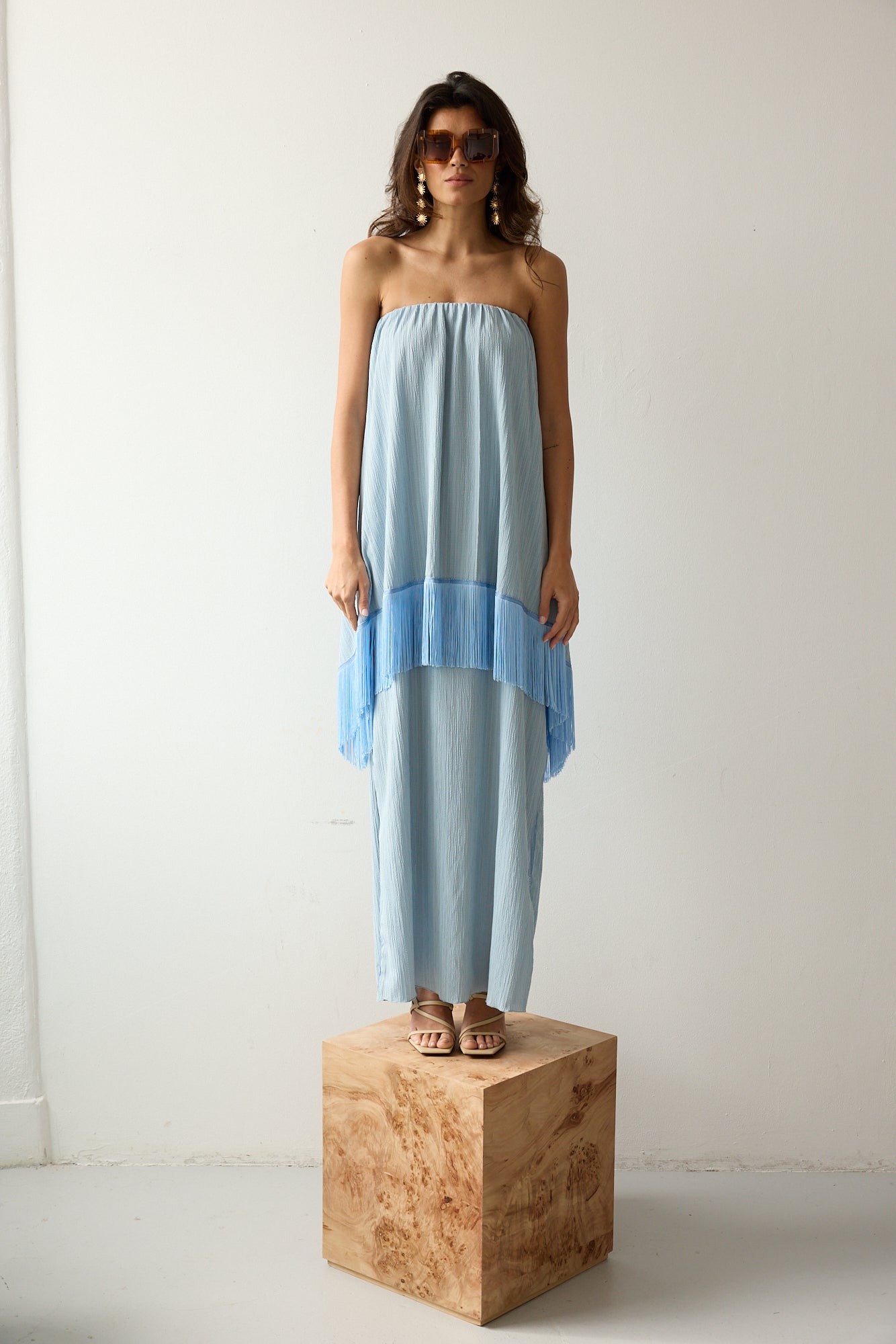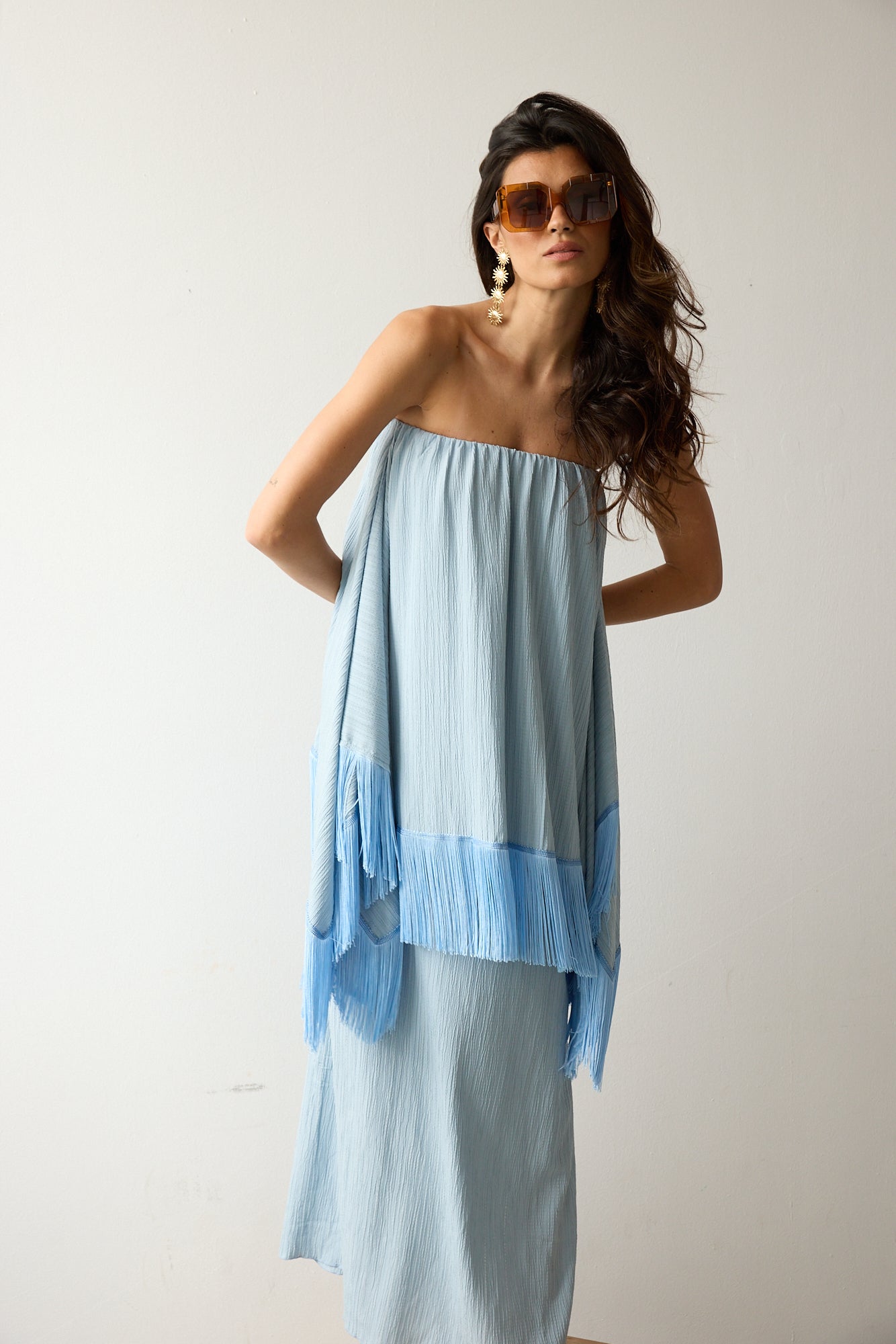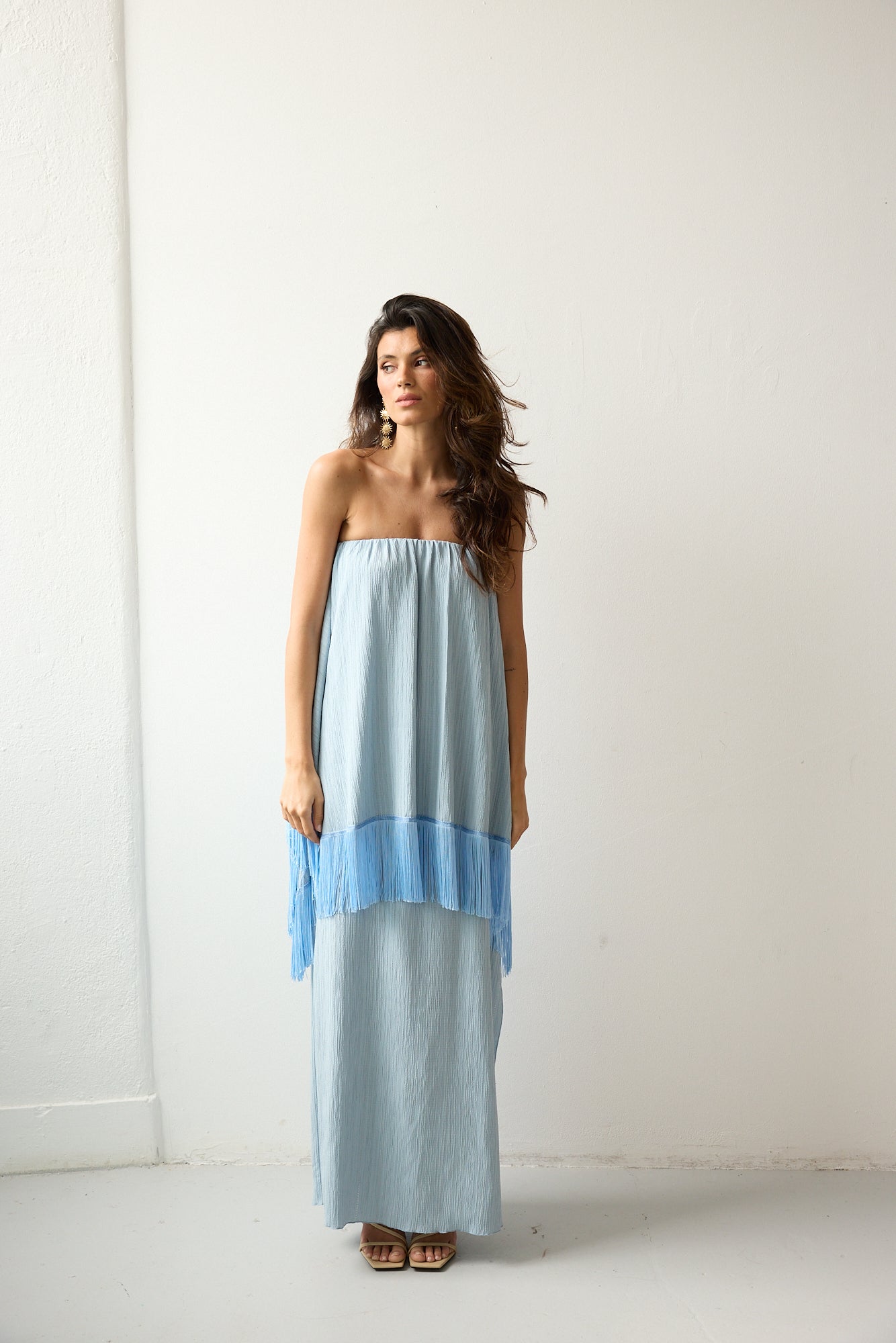 Este elegante vestido sem alças tem uma silhueta fluída e detalhes de franjas ao longo da bainha, adicionando um toque divertido a qualquer ocasião. Perfeito para todas as celebrações desta Primavera-Verão.