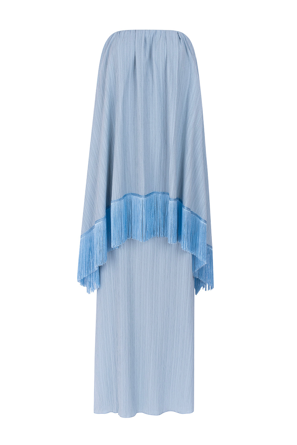 This sleek strapless dress features a flowing silhouette and fringe detail along the hem, adding a playful touch to any occasion. Perfect for spring and summer celebrations.