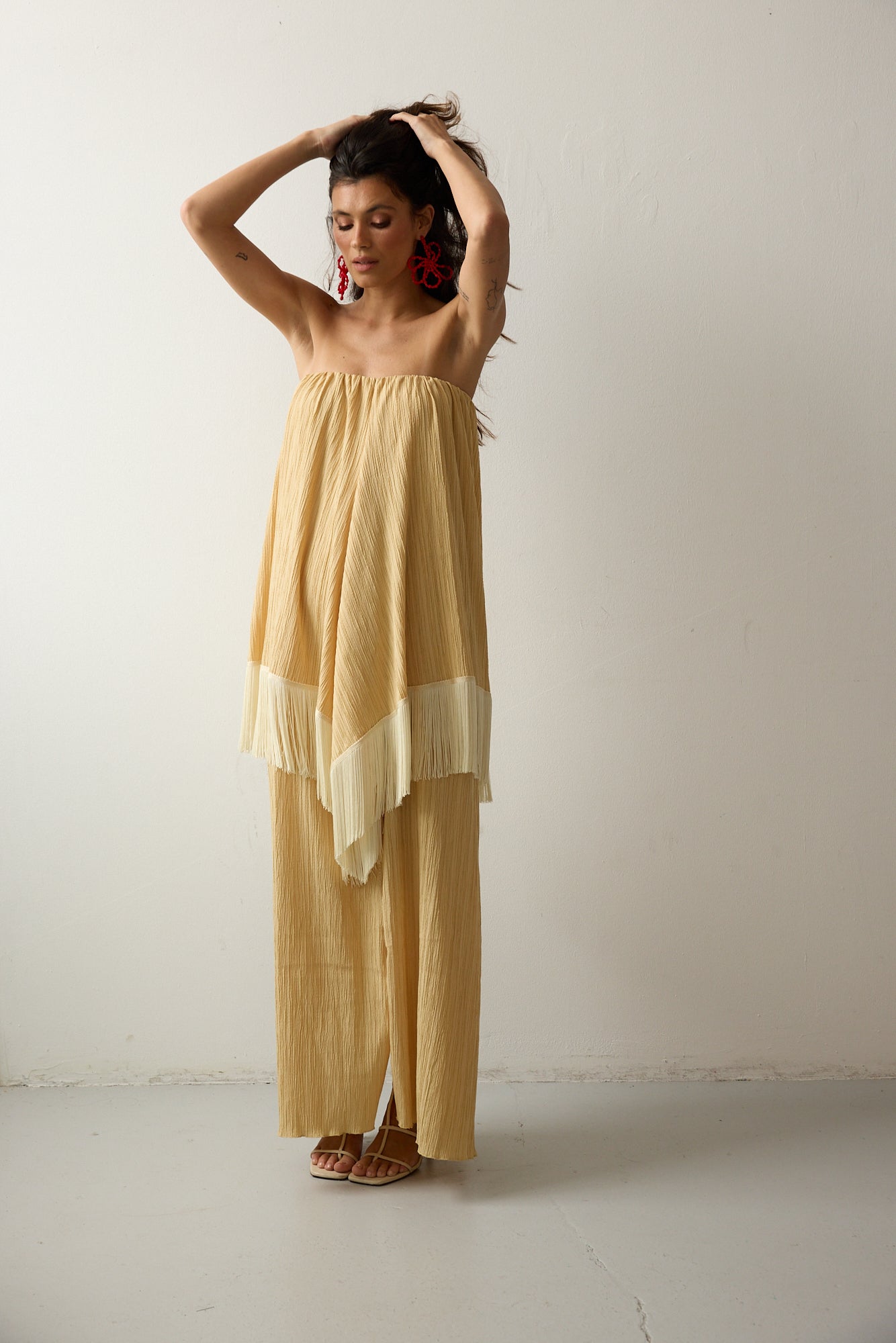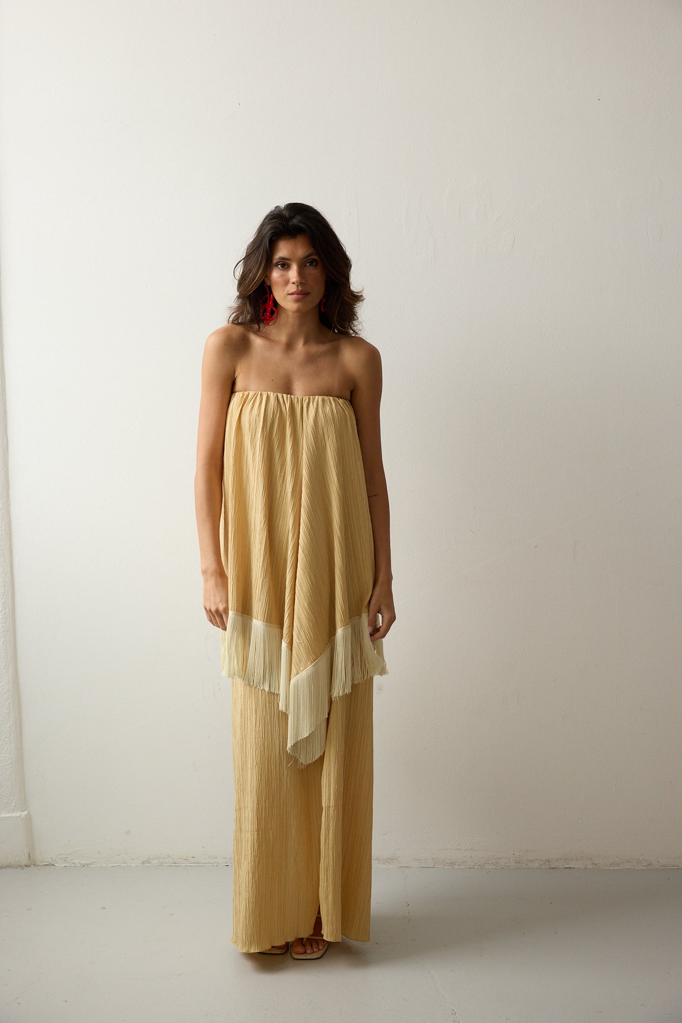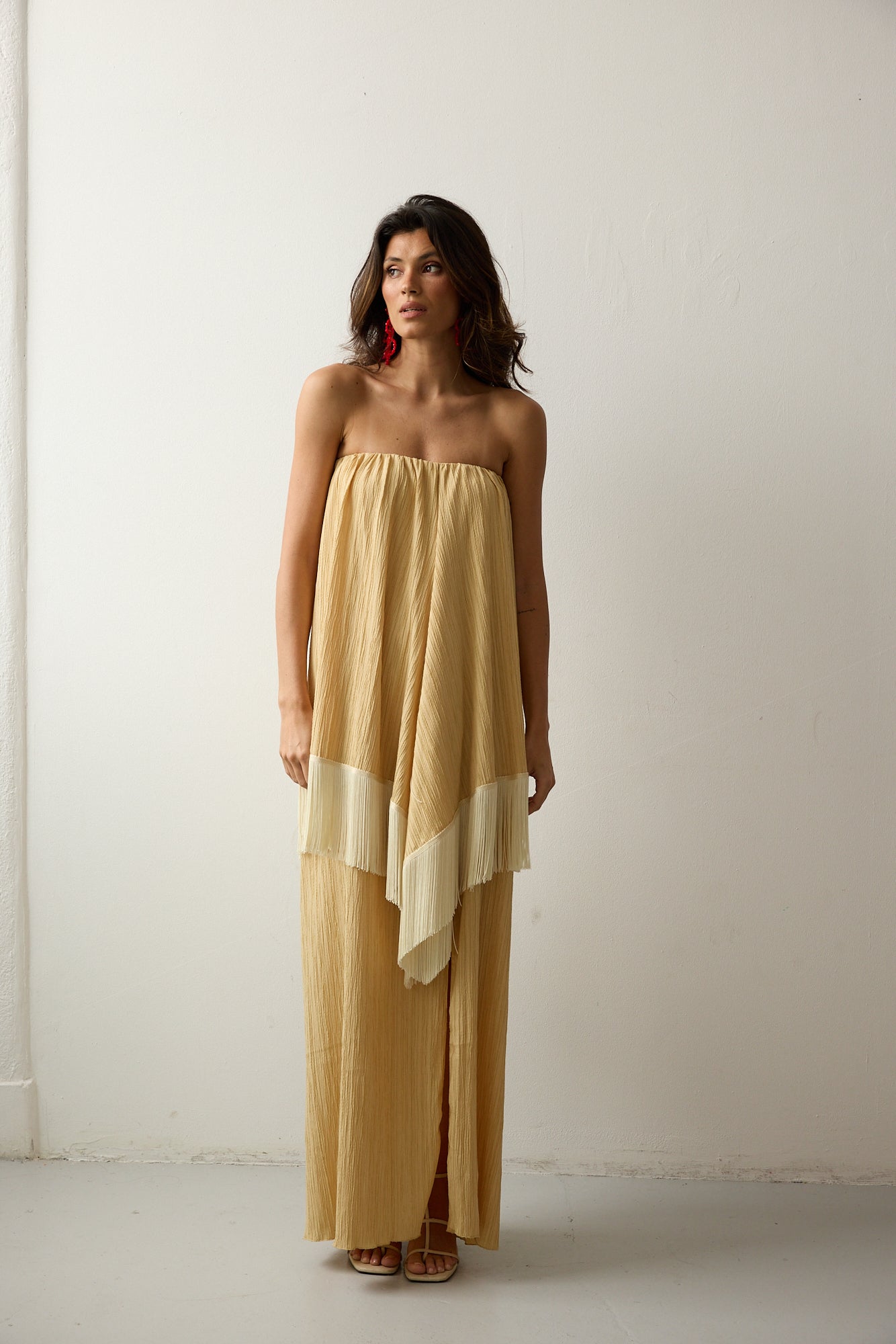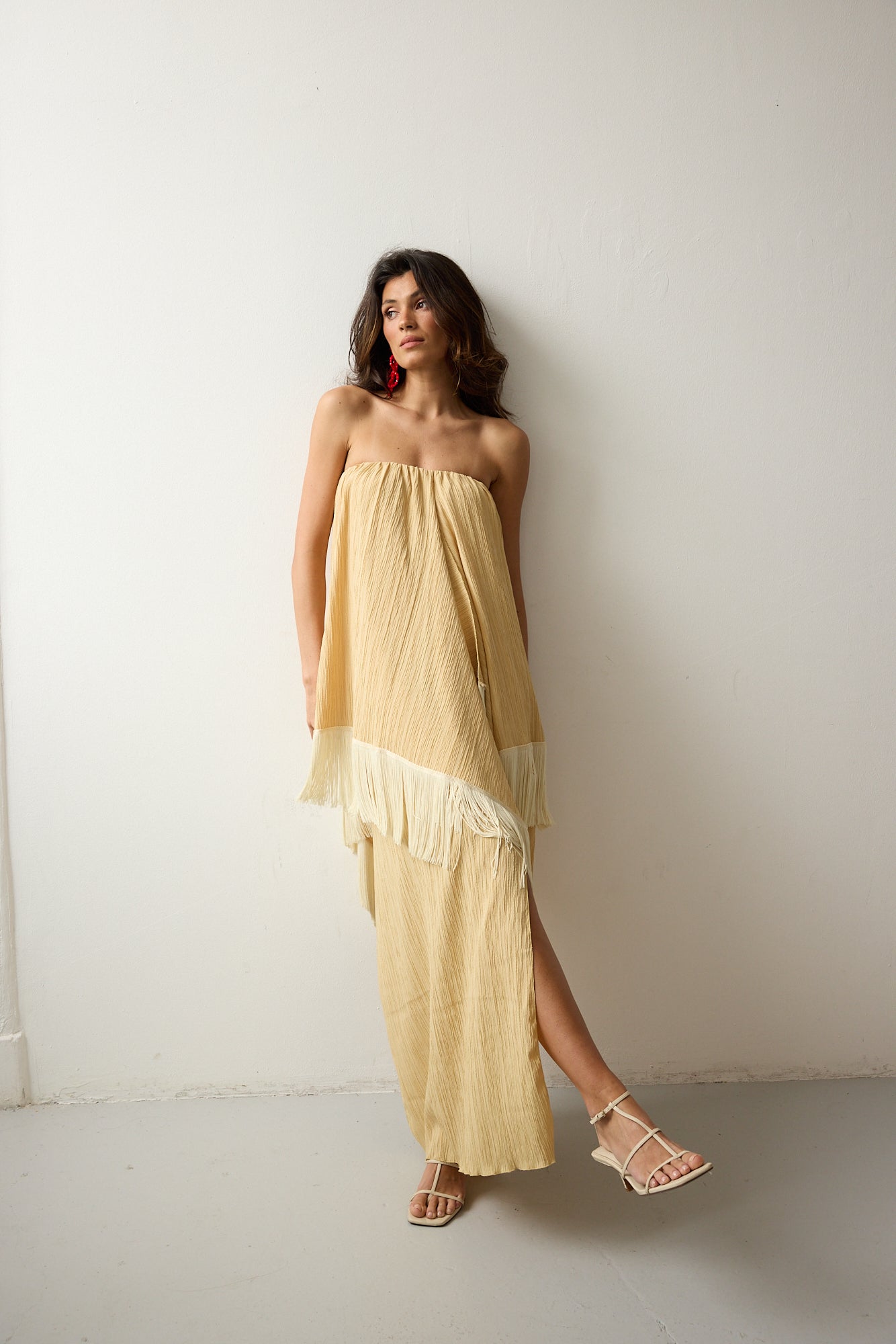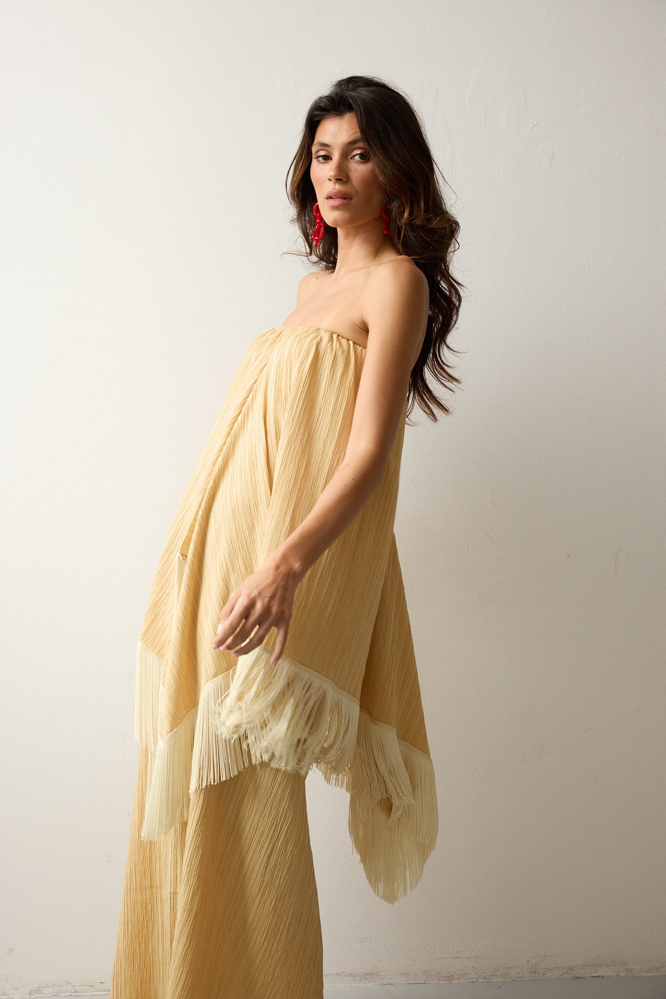 Este elegante vestido sem alças tem uma silhueta fluída e detalhes de franjas ao longo da bainha, adicionando um toque divertido a qualquer ocasião. Perfeito para todas as celebrações desta Primavera-Verão.