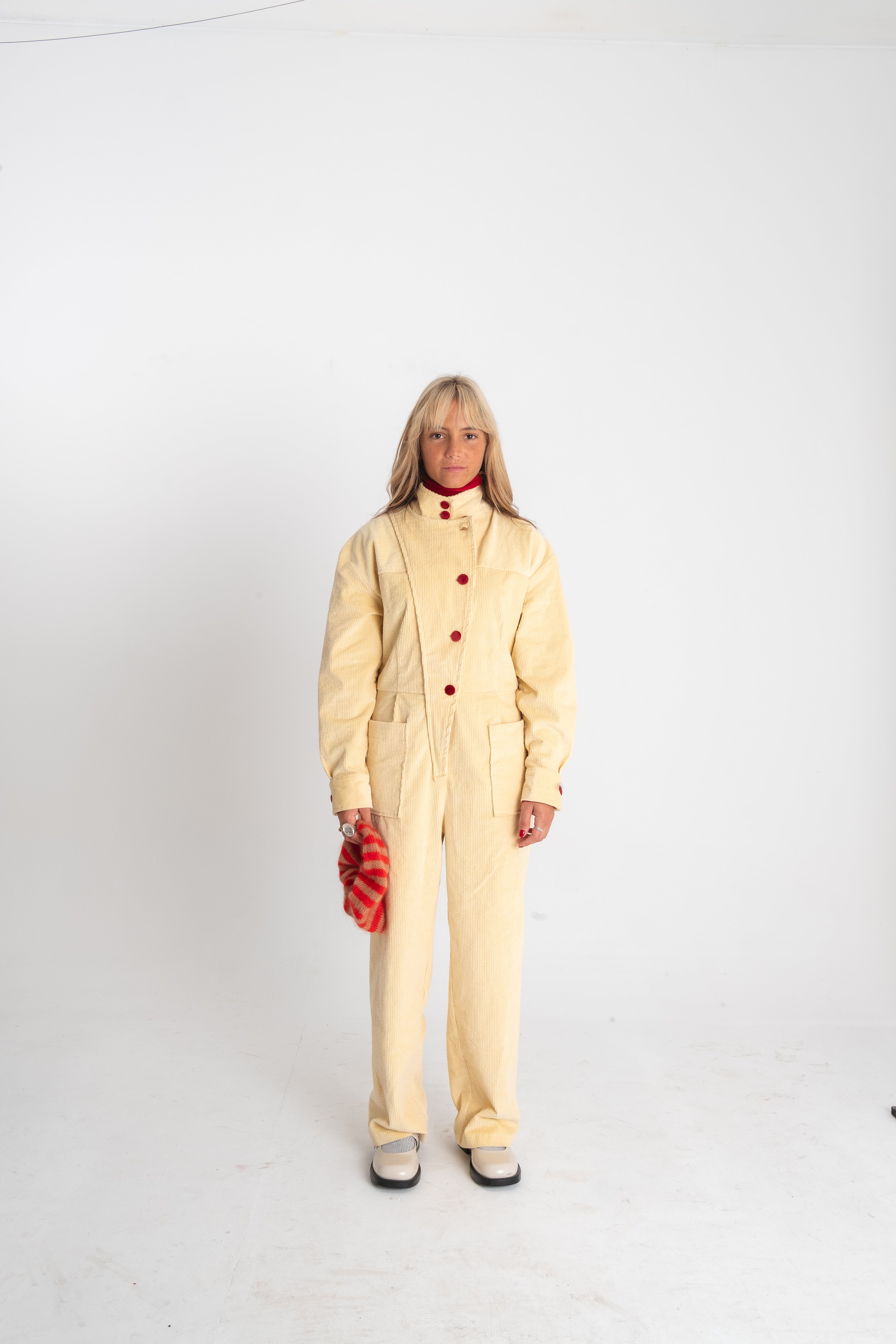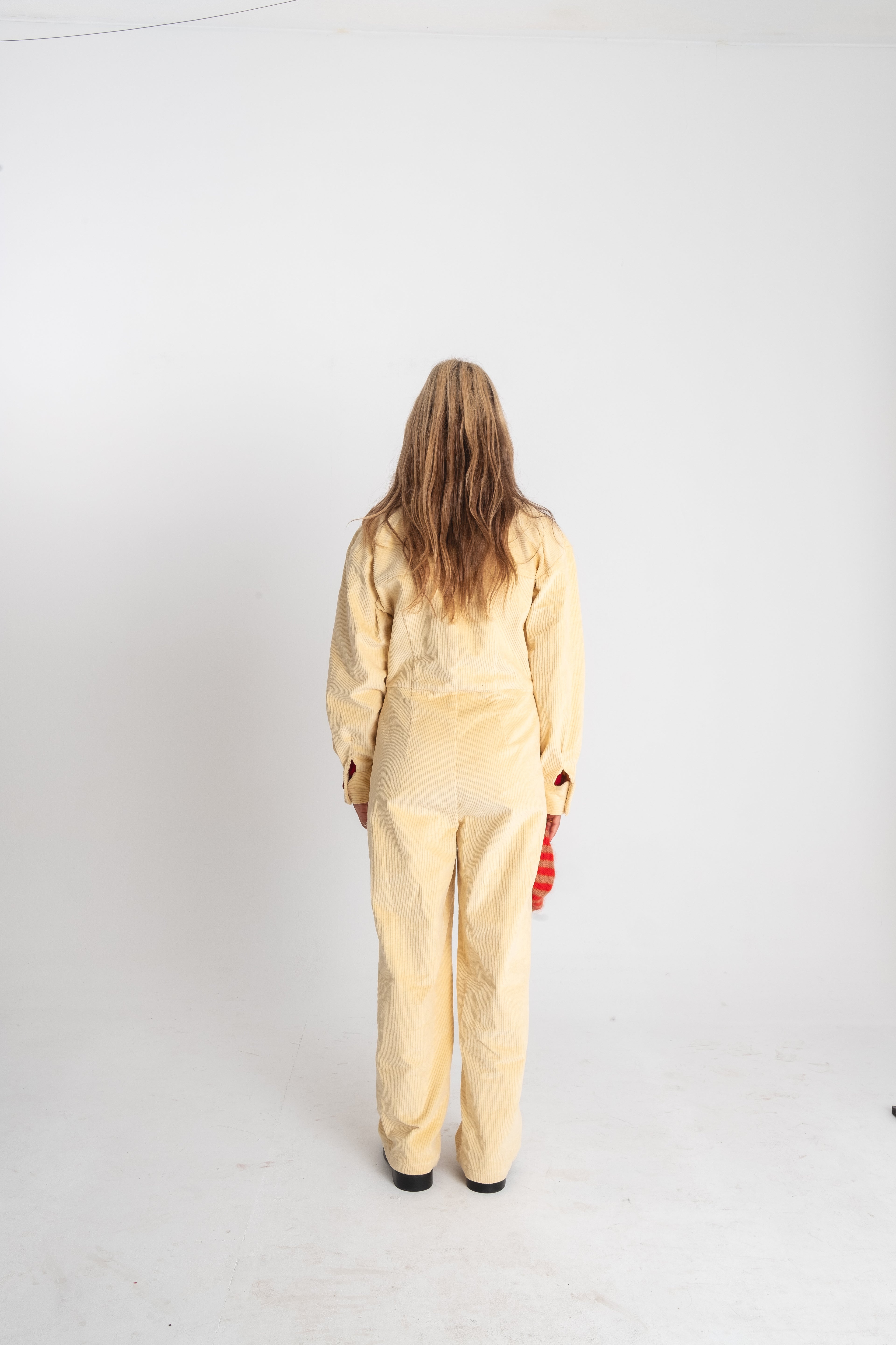 The fitting of the jumpsuit is straight and the corduroy has a little elasticity.