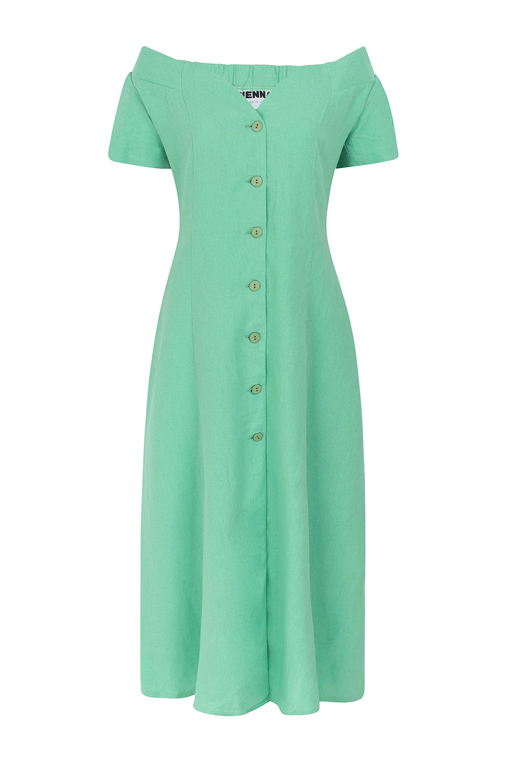 The NORMA dress in PALE GREEN embodies timeless elegance with its vintage-inspired design. Featuring a flattering off-shoulder neckline and delicate front buttons, this feminine piece offers a graceful silhouette perfect for various occasions.