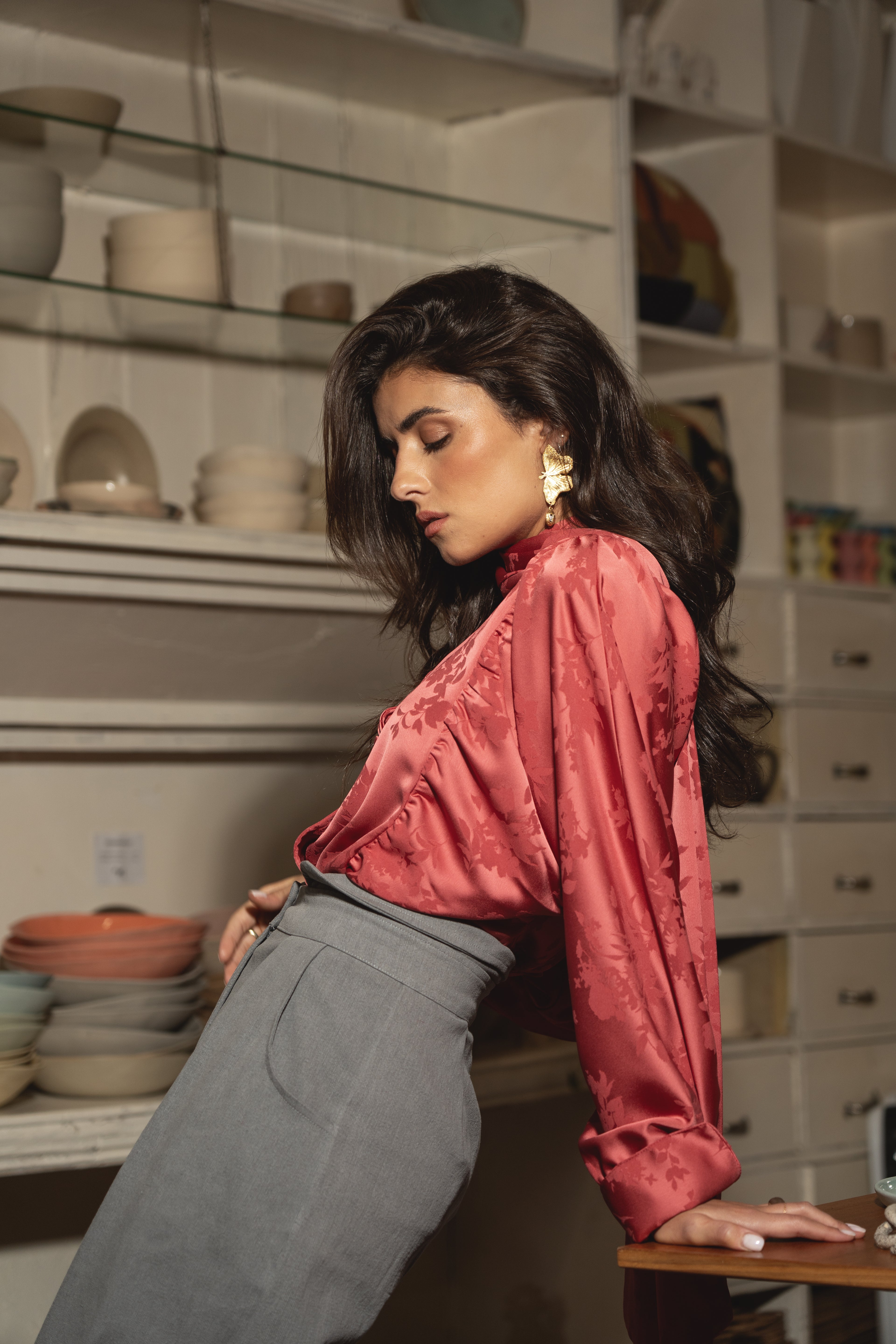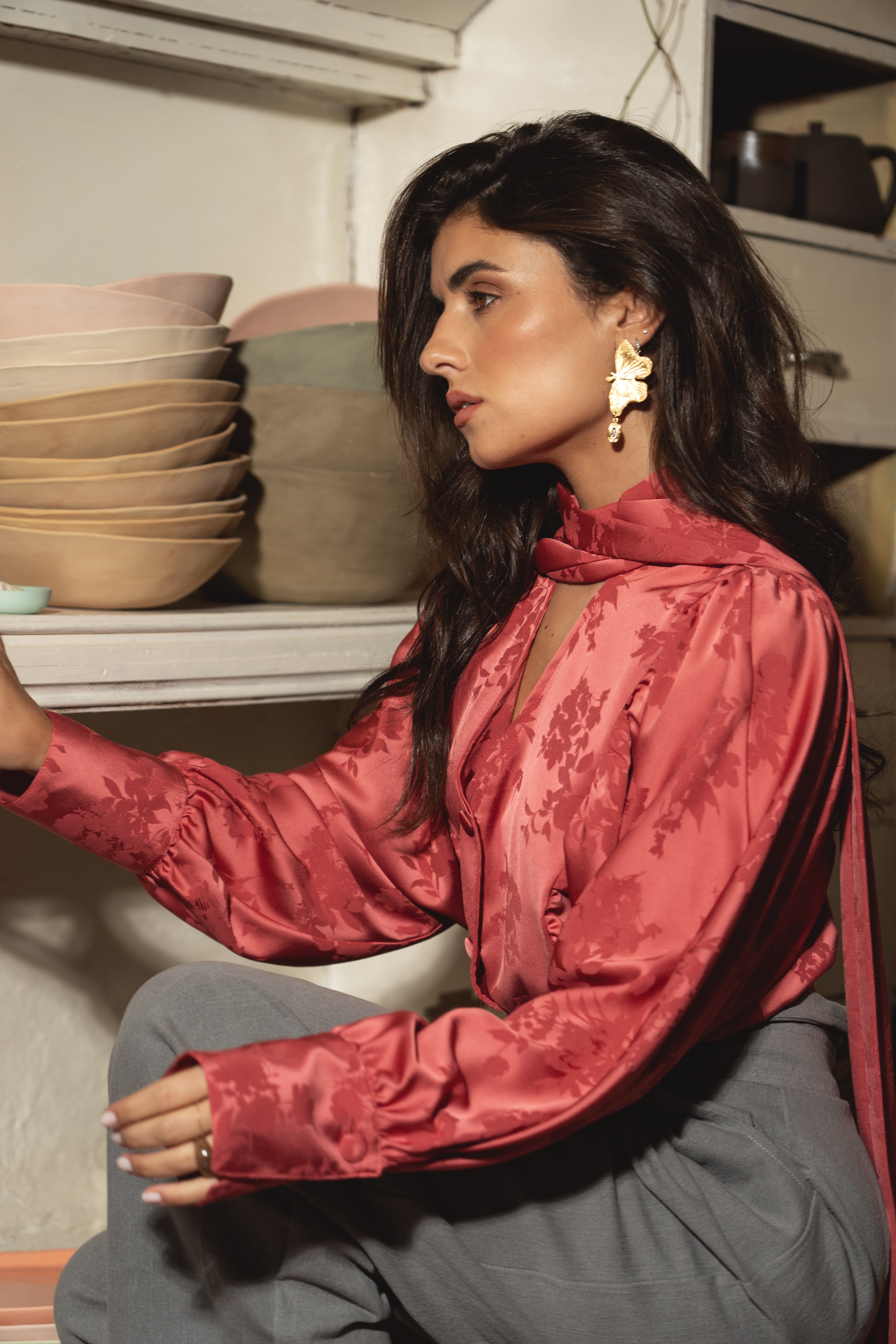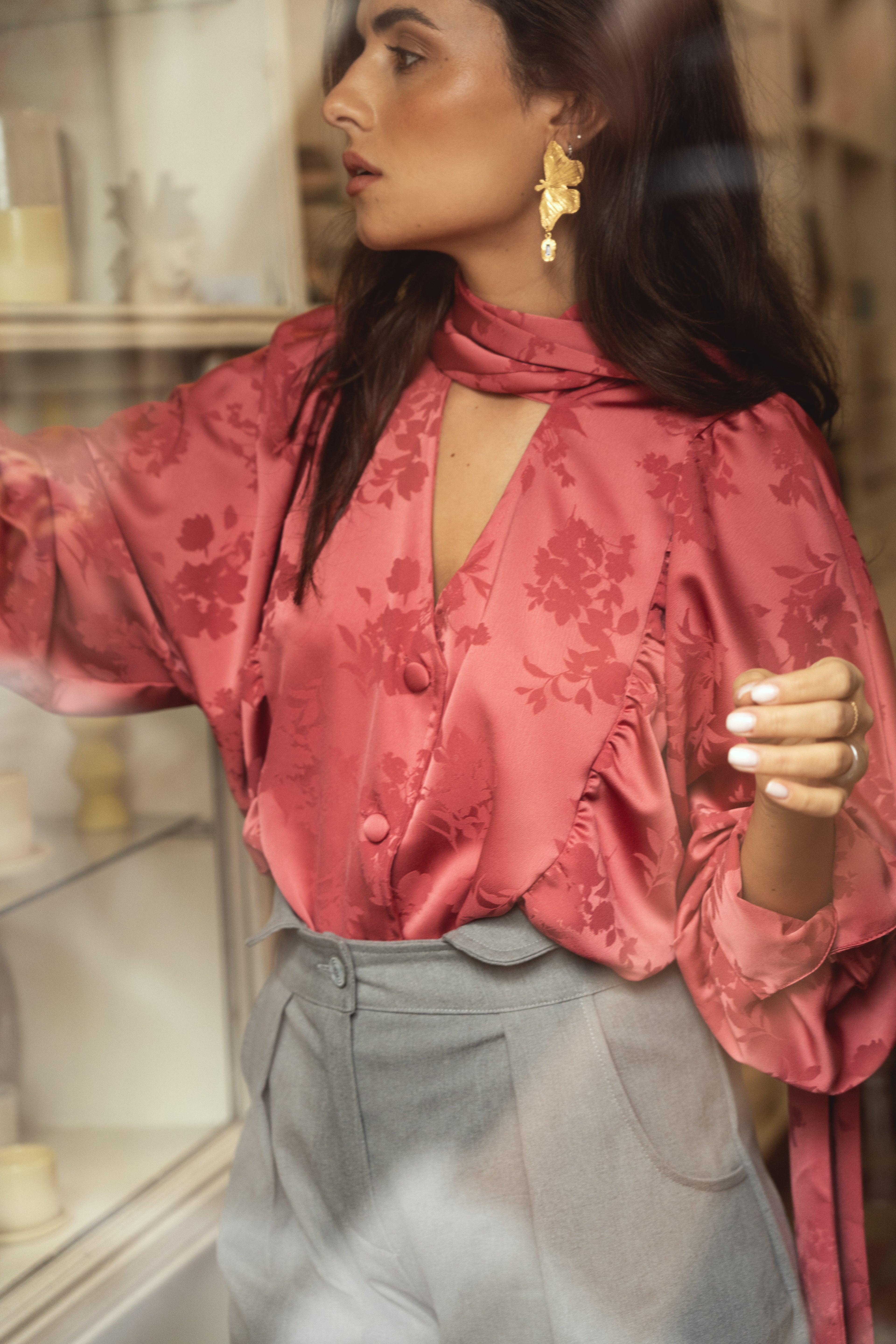 We love our REVIVAL blouse. From the bat sleeves, with ties on the wrists, to the covered buttons on the front, this blouse is great for any context, from work to party celebrations.