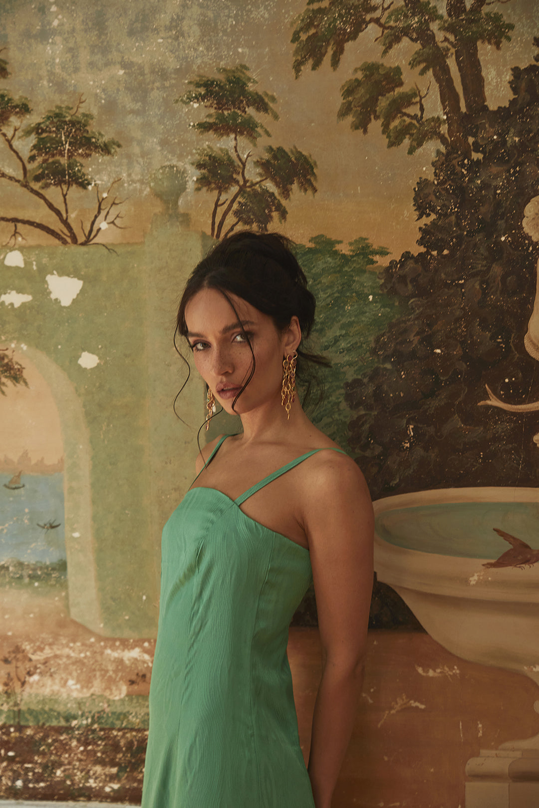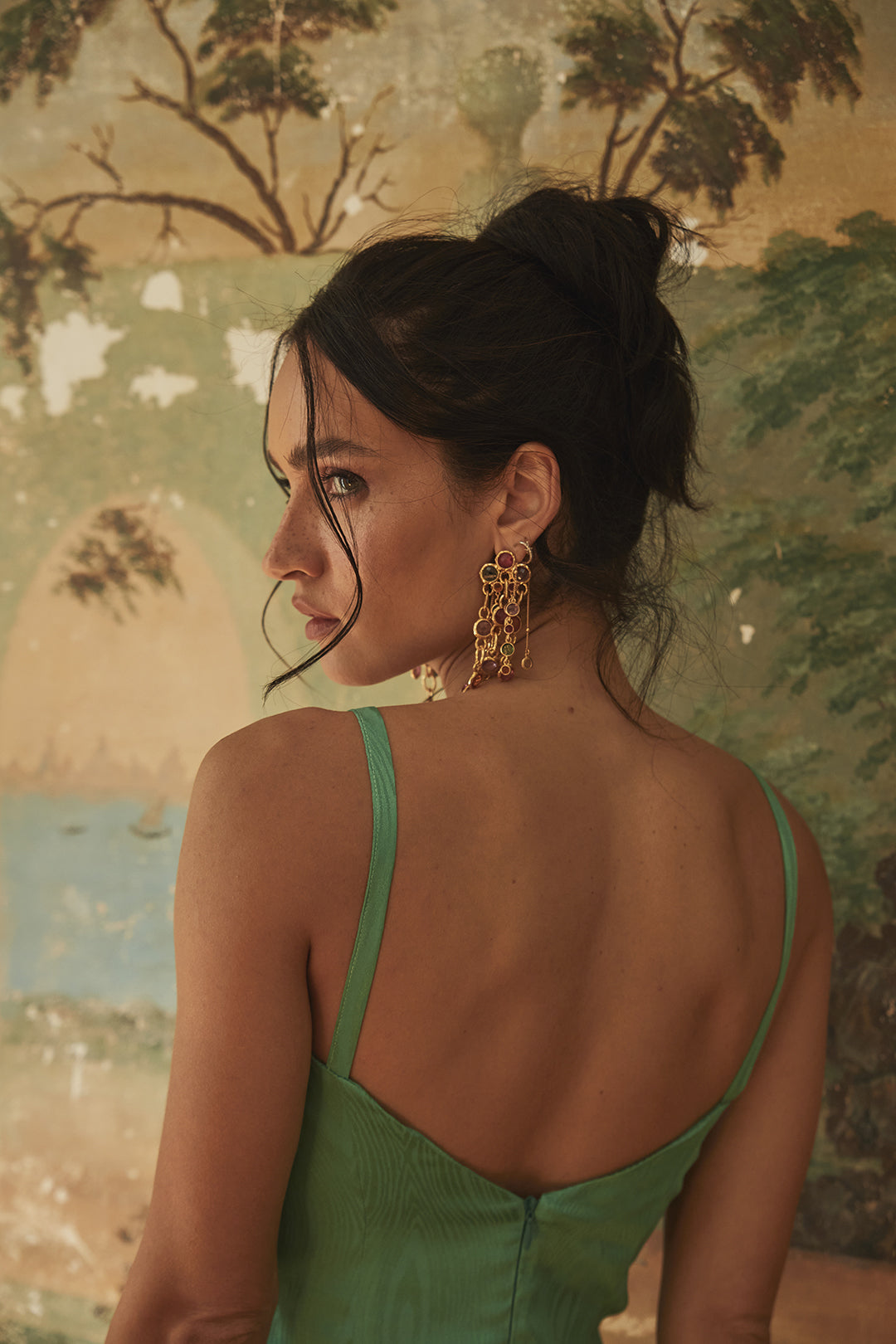 This dress with straight lines and spaghetti straps it’s perfect for any event during this warm season. With a rounded neckline and thin straps, as well as two openings on the front, this piece can be matched with statement accessories or more subtle ones, according to the look you are looking for.
