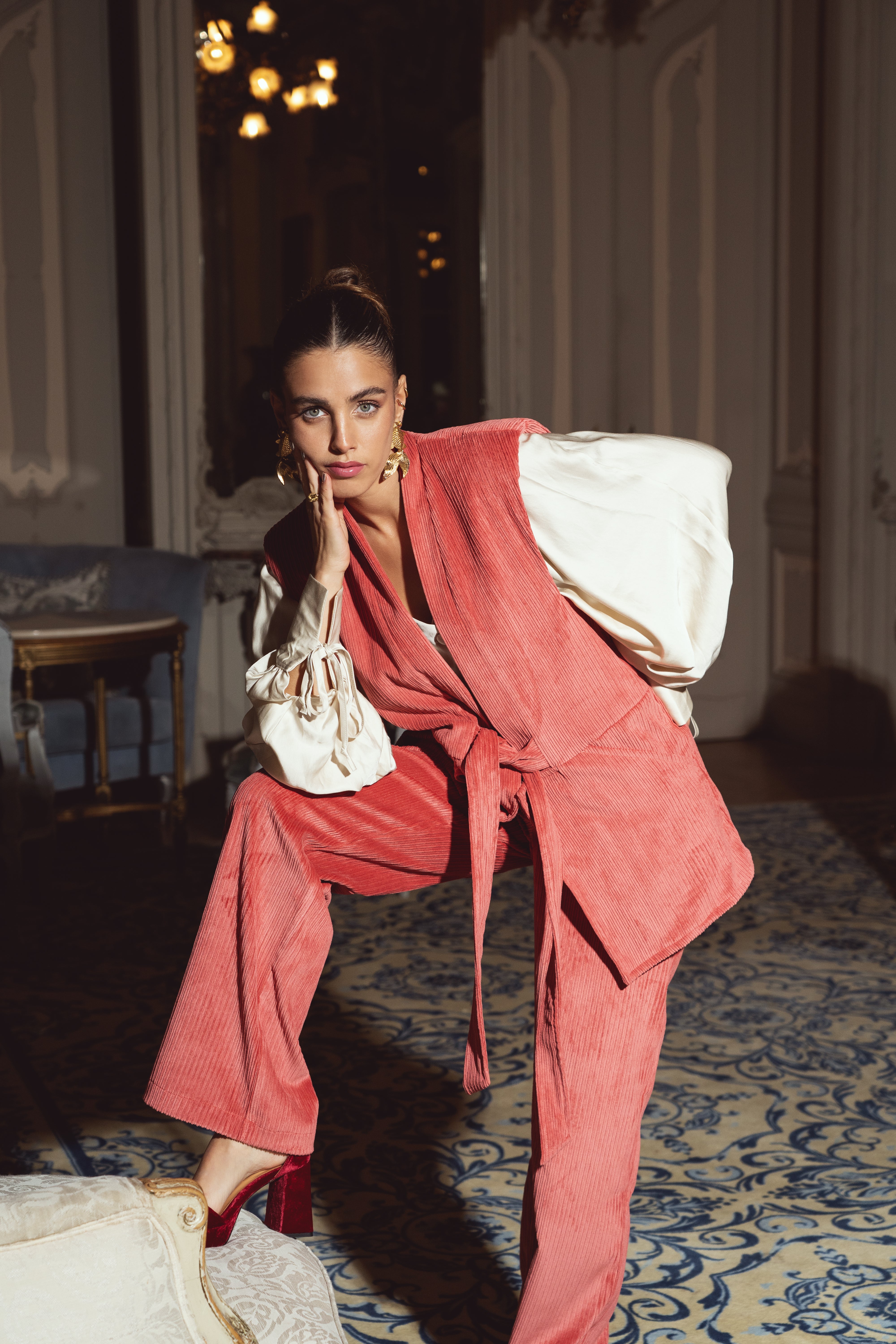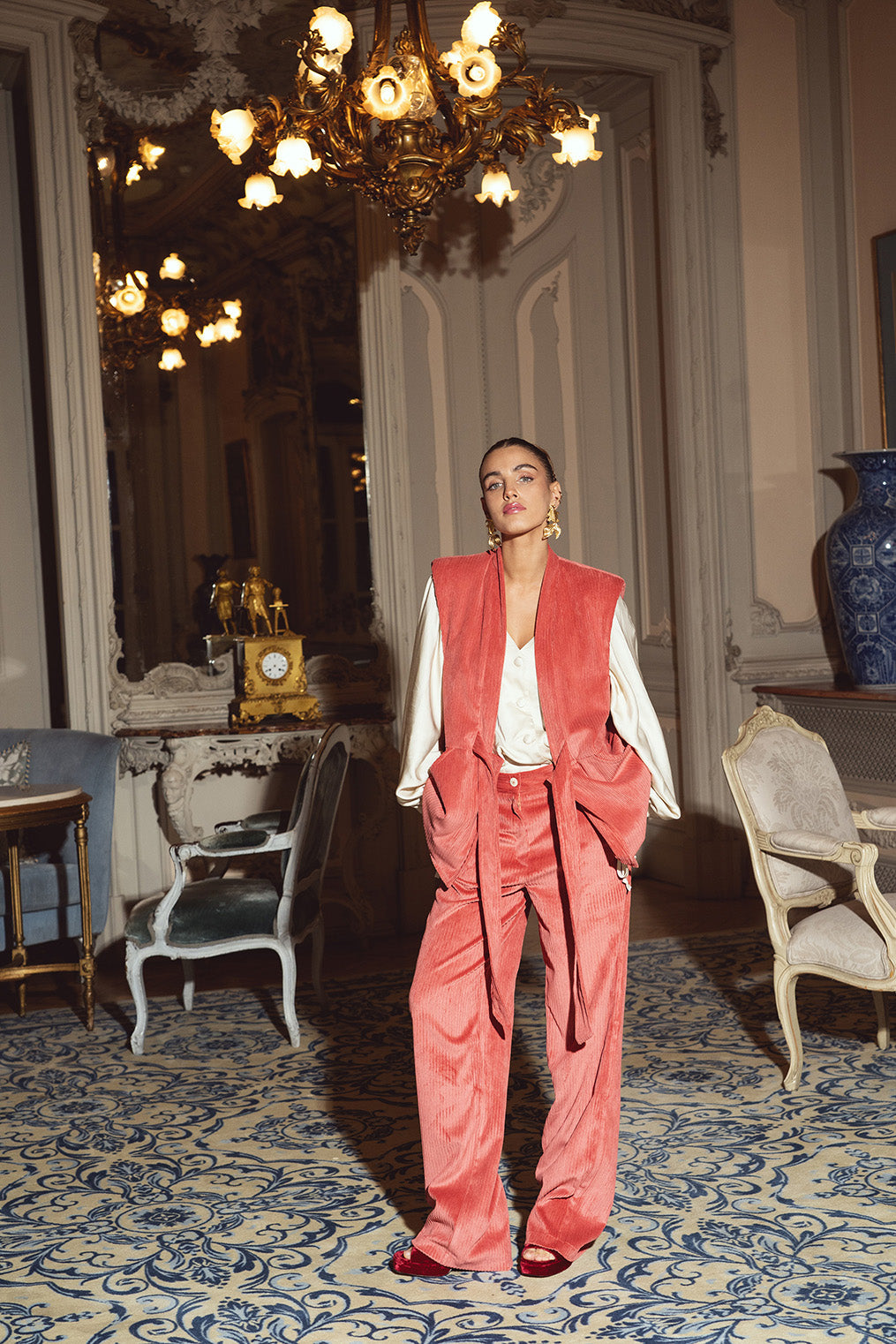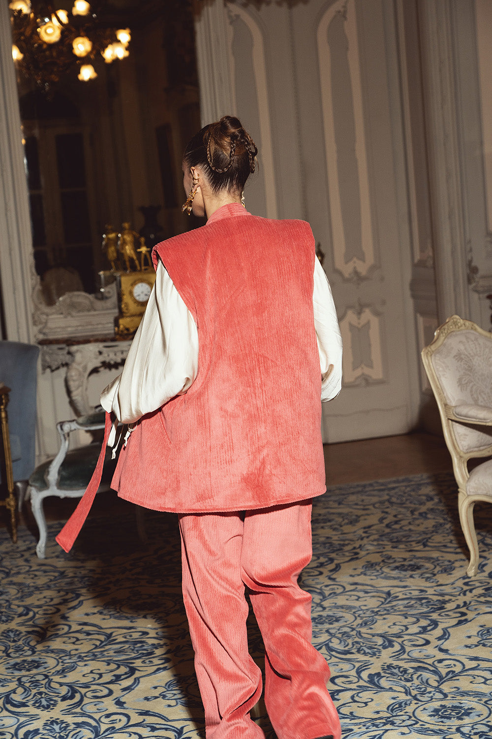 Cut from corduroy with shoulder pads, lining and two straps on the front to close, this vest can be worn with the trousers of the set or with relaxed fit jeans and a shirt.