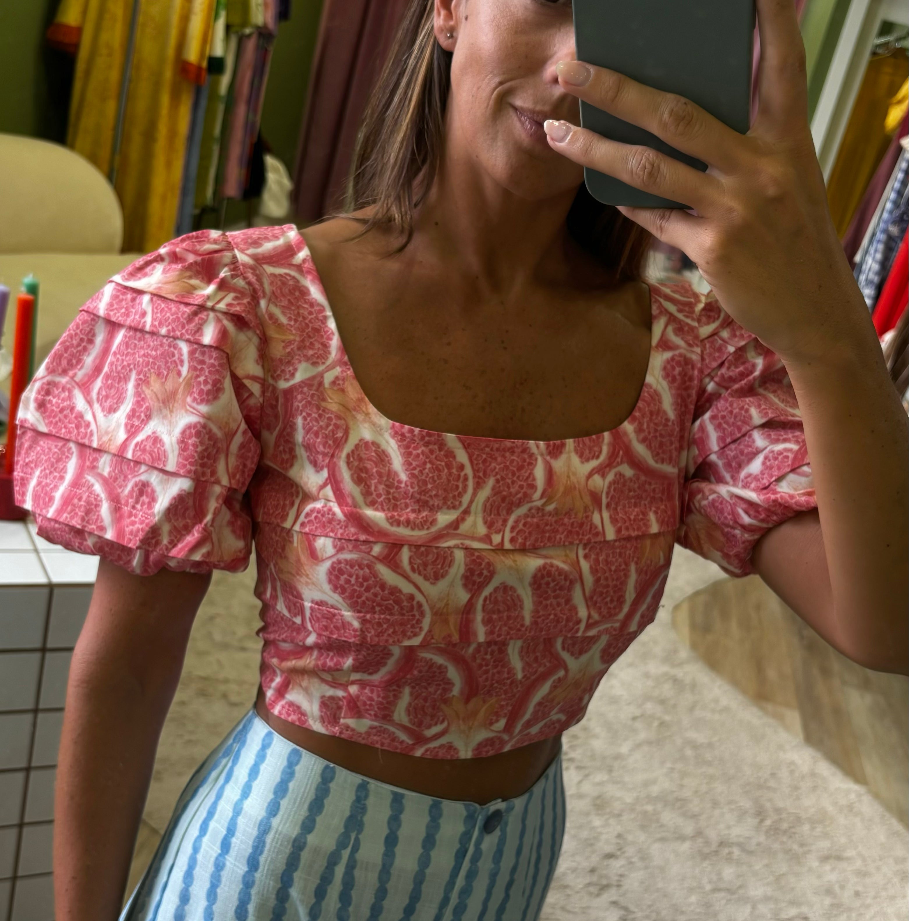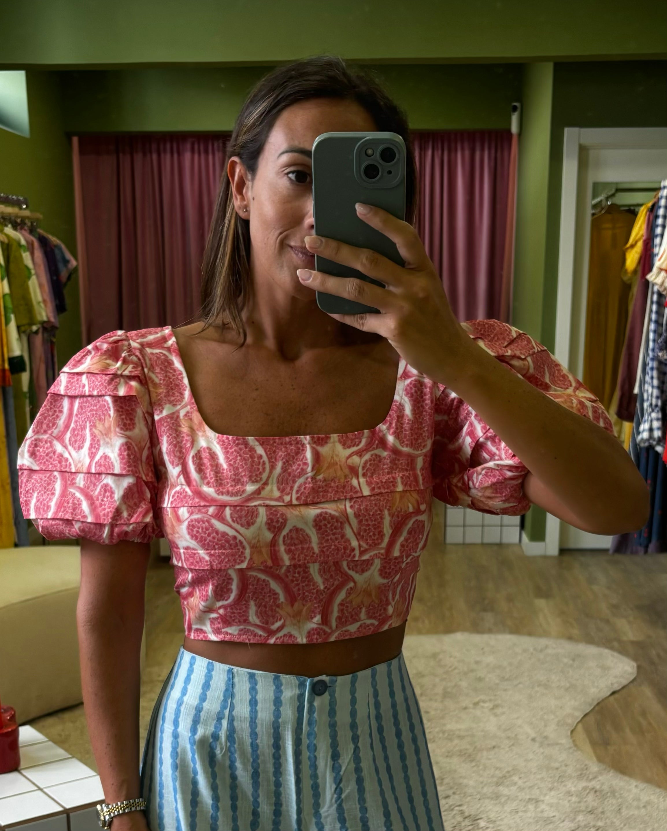 O nosso bestseller Frida está de volta! Como nós adoramos as suas mangas ballon e o seu laço romântico nas costas. Feito em algodão, este top super versátil e feminino pode ser conjugado com saia, calças ou calções, dependendo da ocasião.