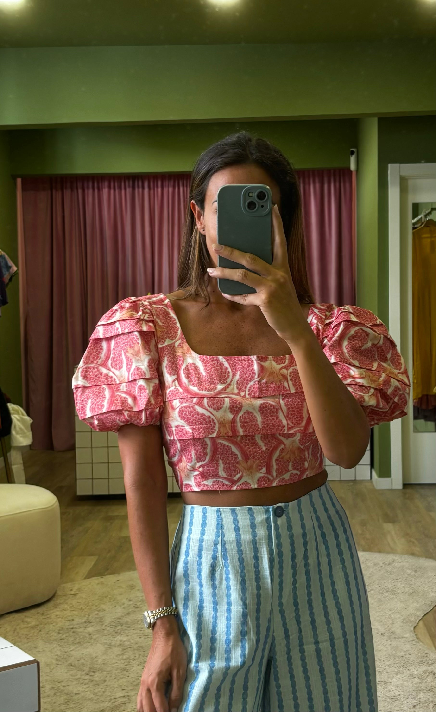 Our bestseller Frida is back! How we love it's ballon sleeves and it's romantic bow on the back. Made of cotton, this super versatile and feminine top can be combined with skirt, pants or shorts, depending on the occasion.