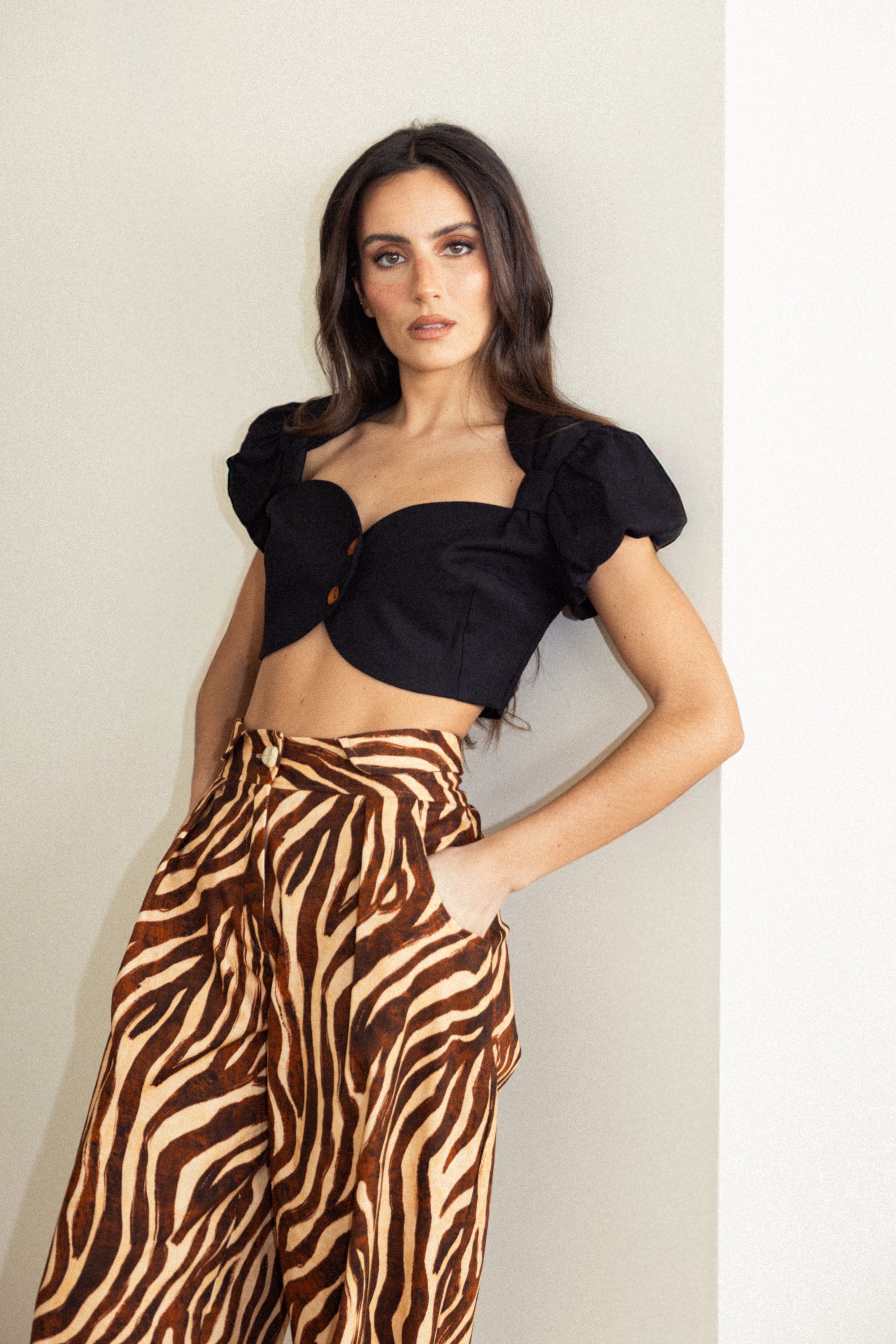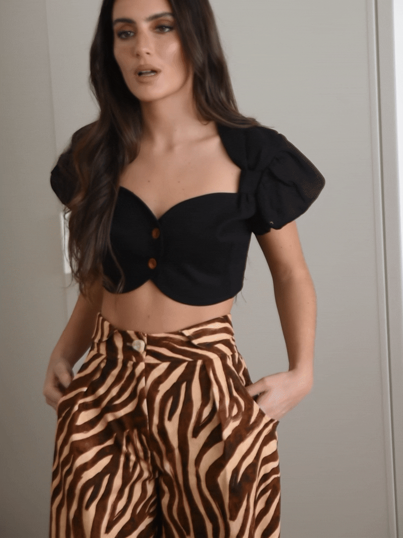 Com manga curta e botões na frente, este crop top é uma peça que poderá acompanha-la toda a estação de Primavera-Verão.