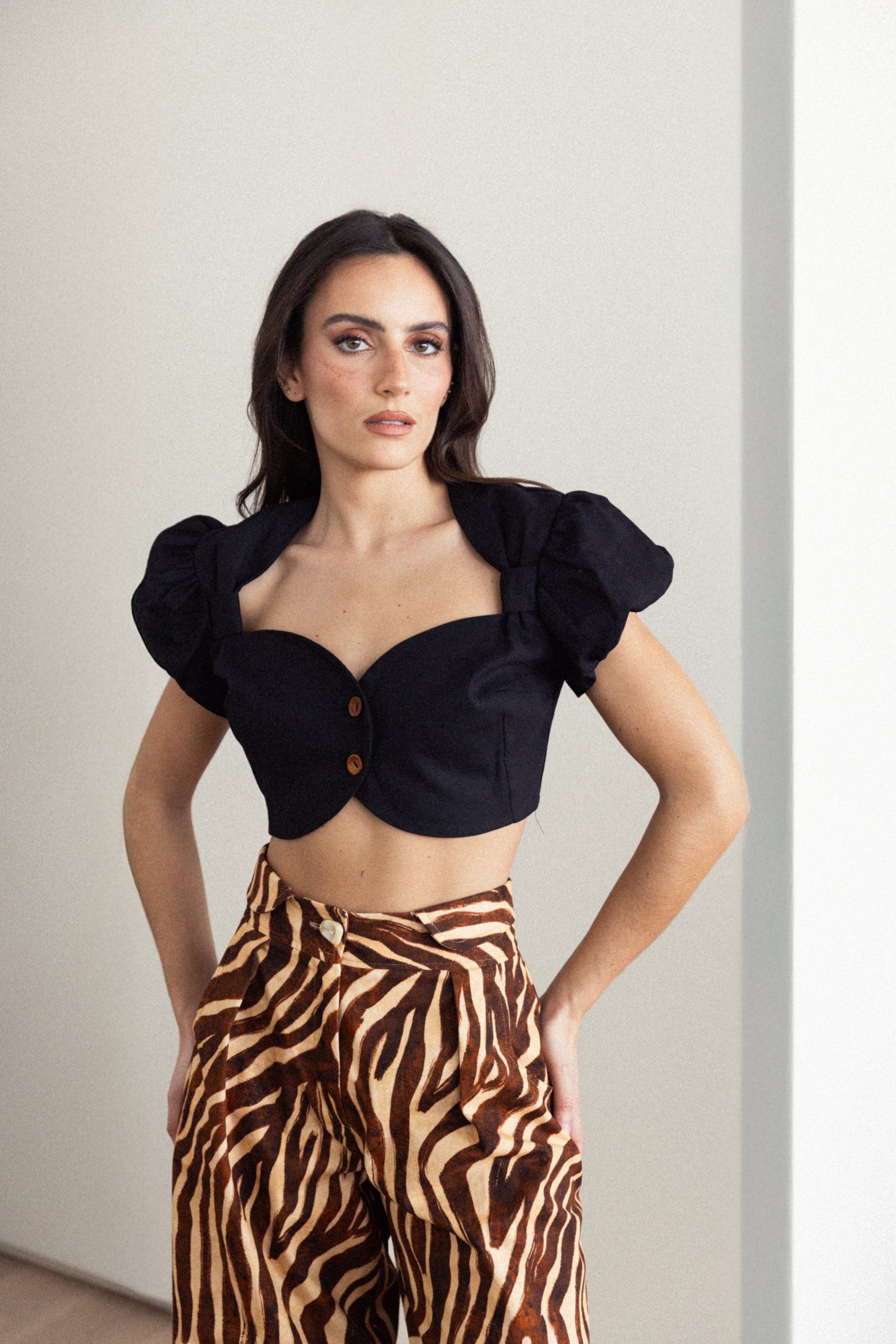 With short sleeves and buttons on the front, this crop top is a piece that can accompany you throughout the Spring-Summer season.