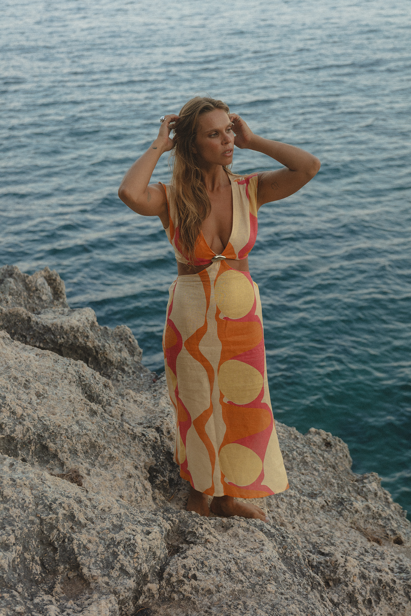 O HORIZON dress é um vestido fresco, feminino e minimalista. Com aplicação de uma peça metálica no centro do peito e aberturas na lateral, este vestido é perfeito para festas de fim de dia, caminhadas à beira mar ou um passeio pelo sua cidade predileta.