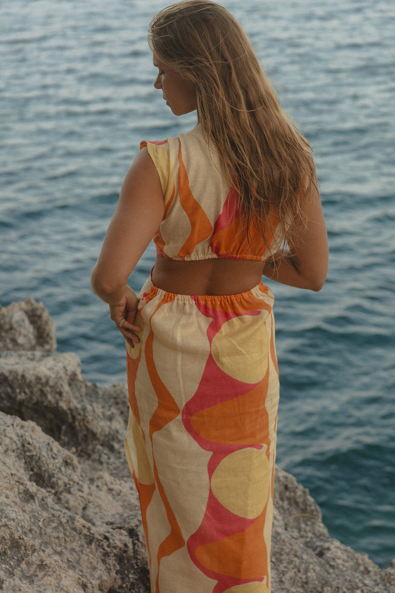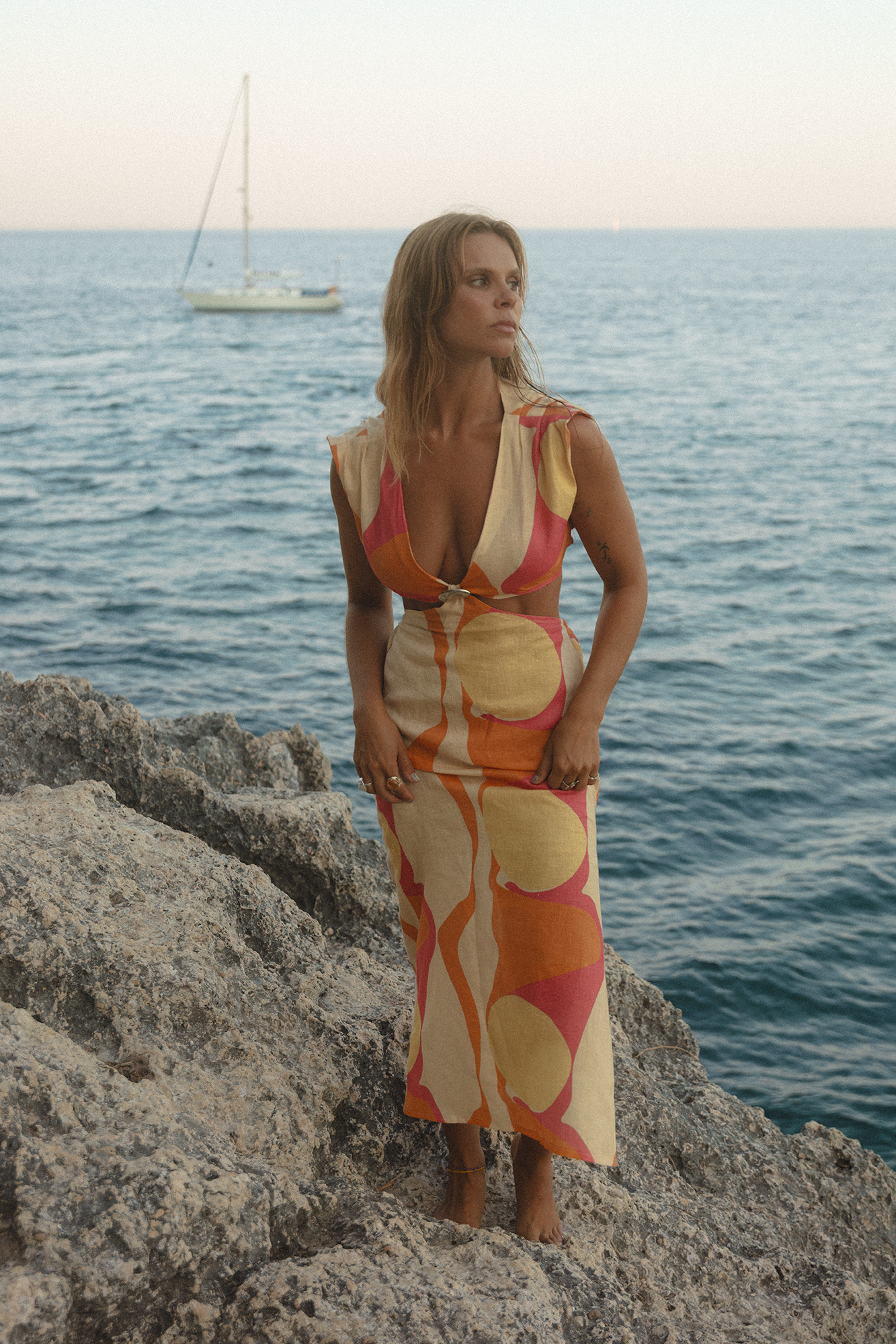 The HORIZON dress is a fresh, feminine, and minimalist dress. With a metallic piece in the center of the chest and side slits, this dress is perfect for end-of-day parties, walks by the sea, or a stroll through your favorite city.