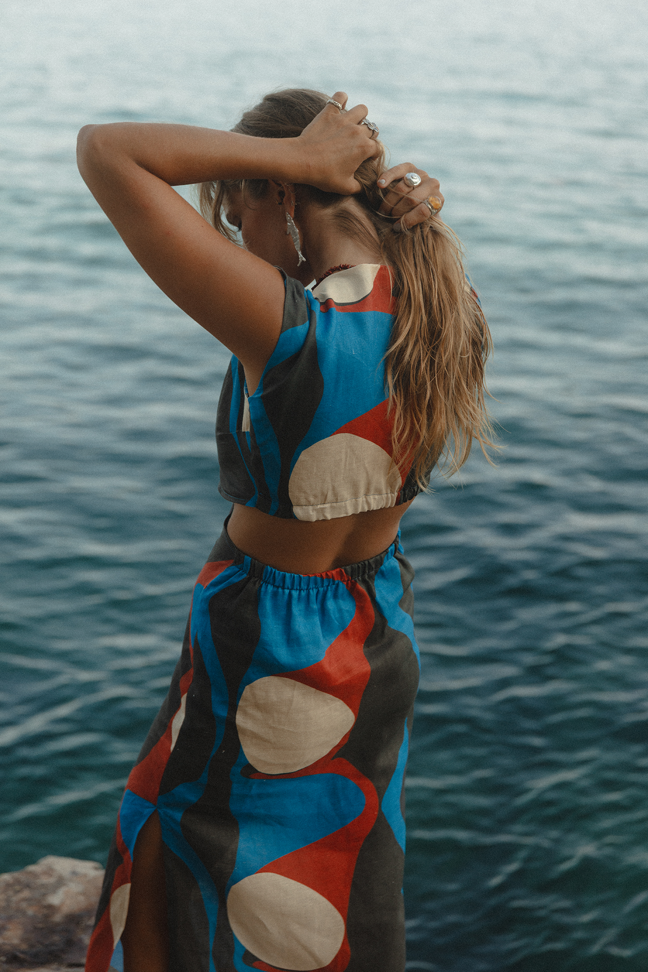 The HORIZON dress is a fresh, feminine, and minimalist dress. With a metallic piece in the center of the chest and side slits, this dress is perfect for end-of-day parties, walks by the sea, or a stroll through your favorite city.