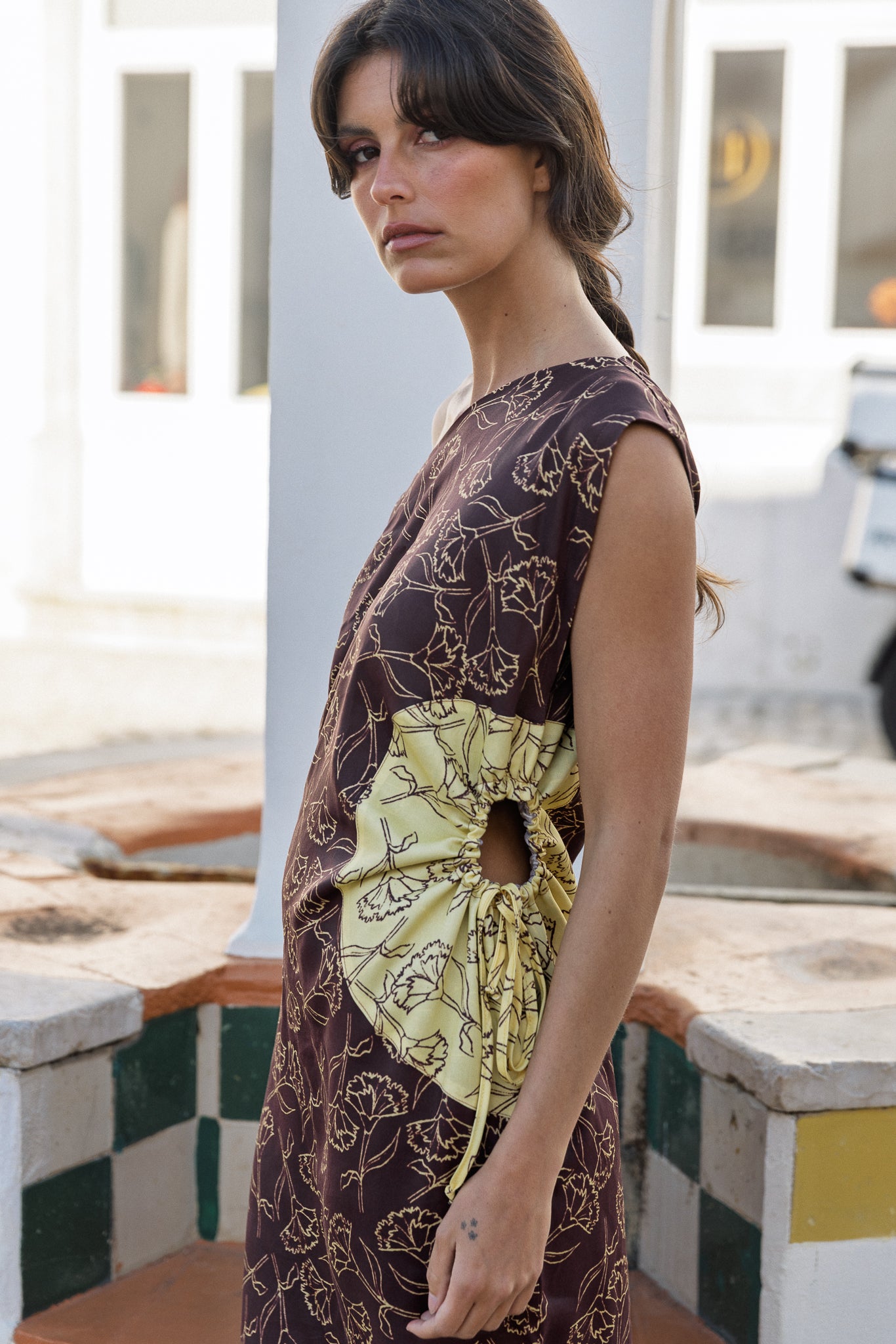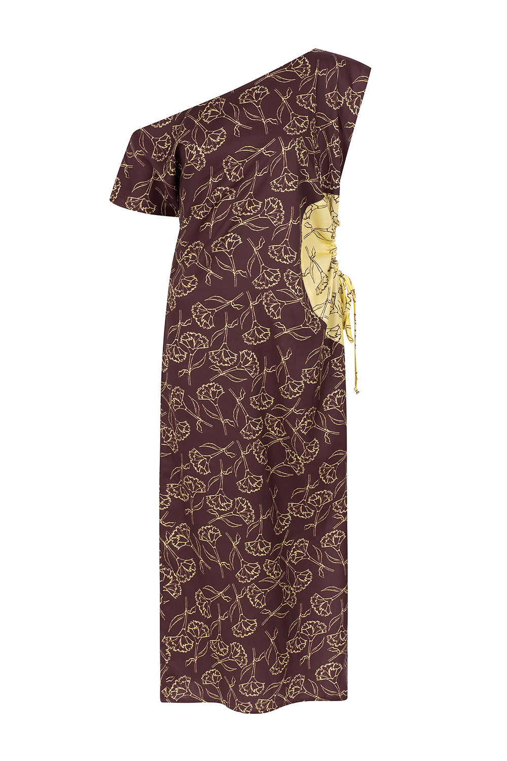 This elegant LEONOR dress in BROWN CARNATIONS is perfect for parties.