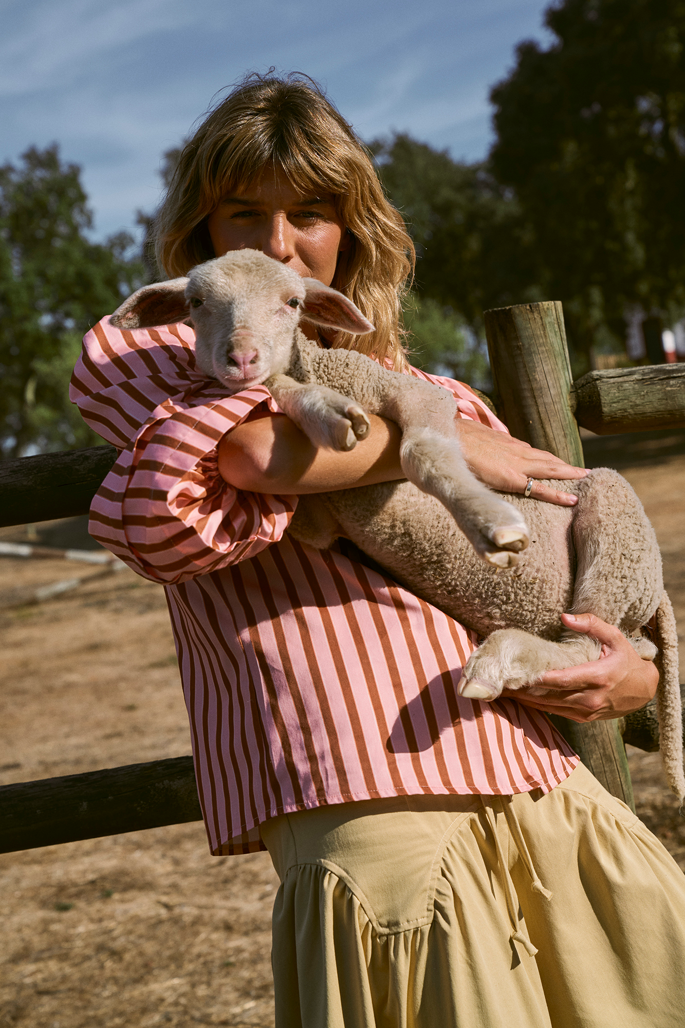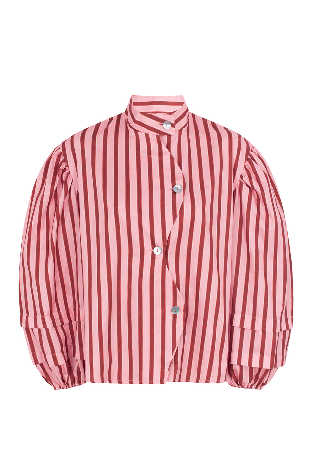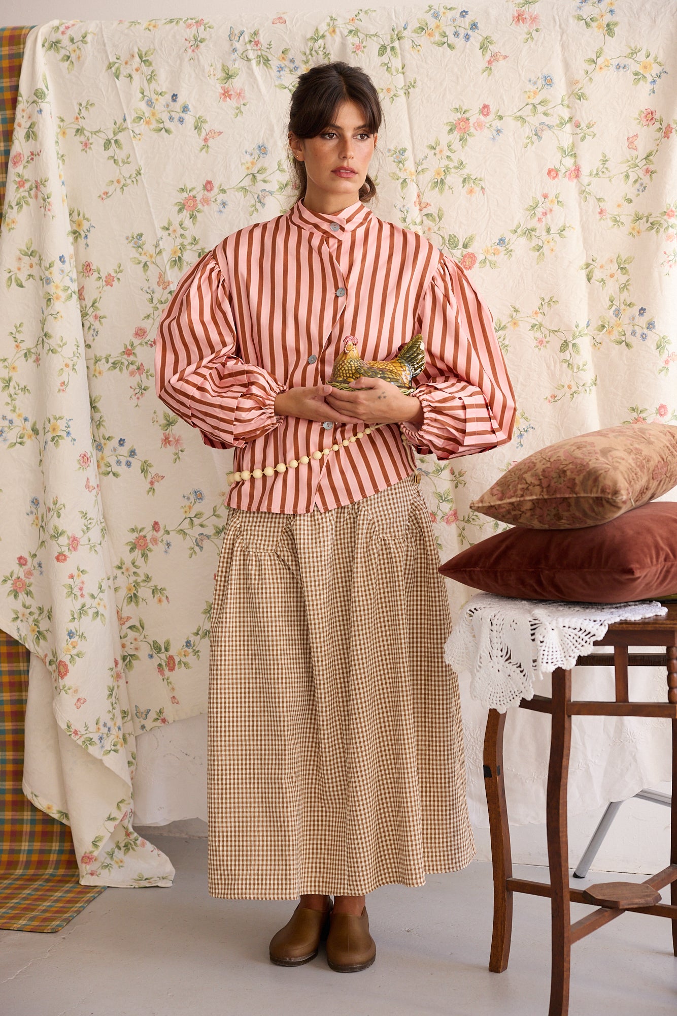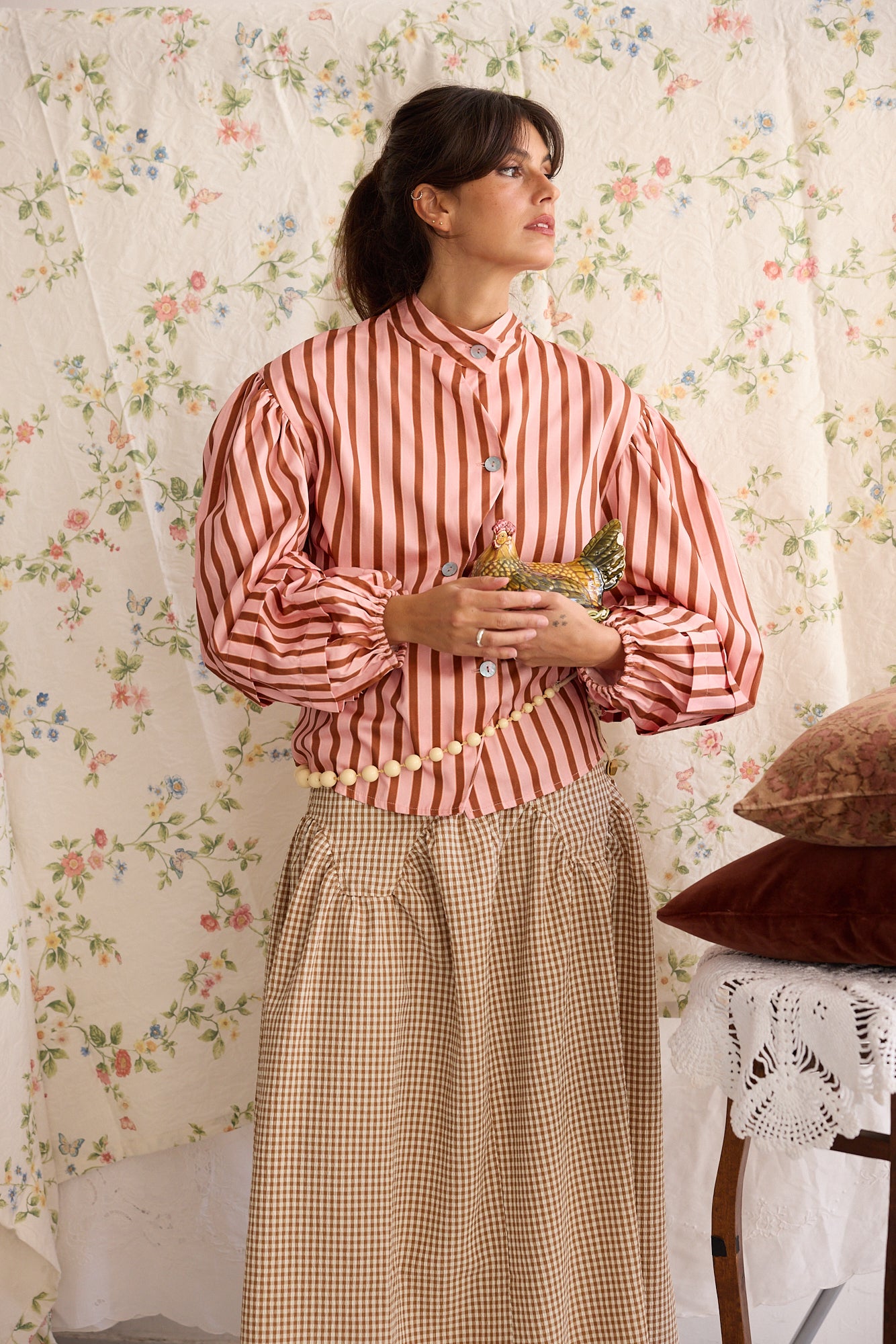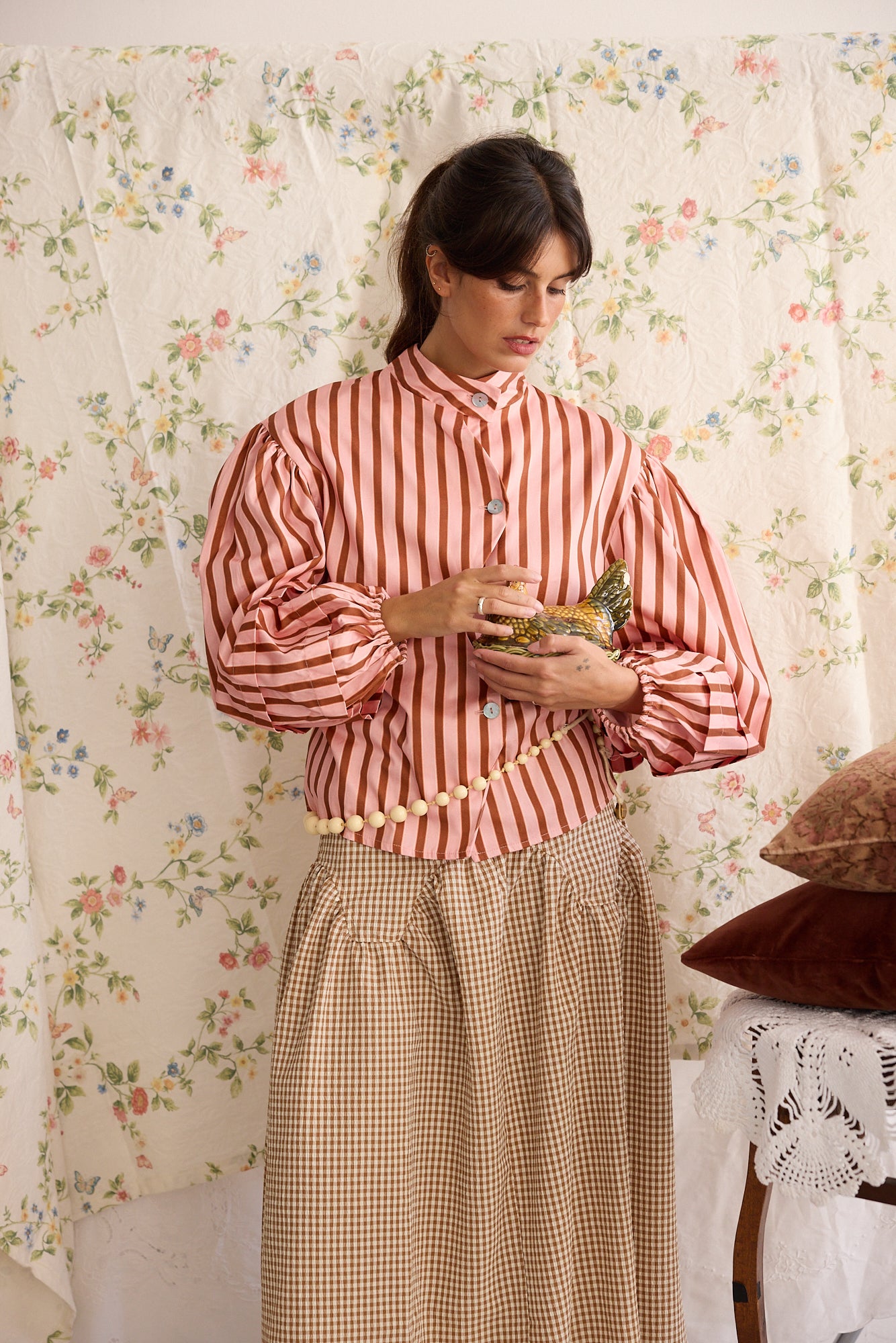 The pink and brown striped pattern was designed by the Sienna team, inspired by traditional shirtmaking. A stylish piece that pairs perfectly with the PALMIRA pants.