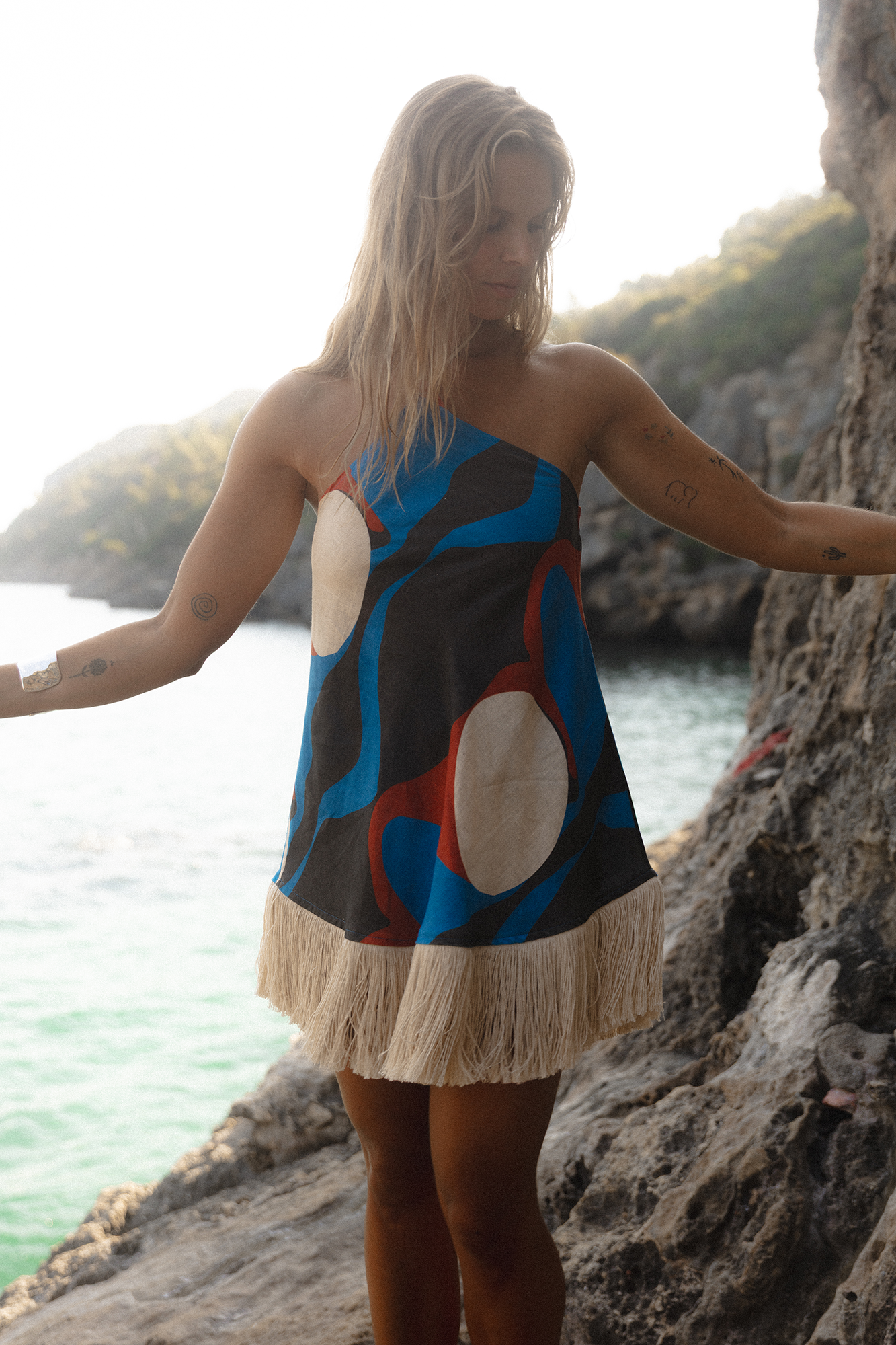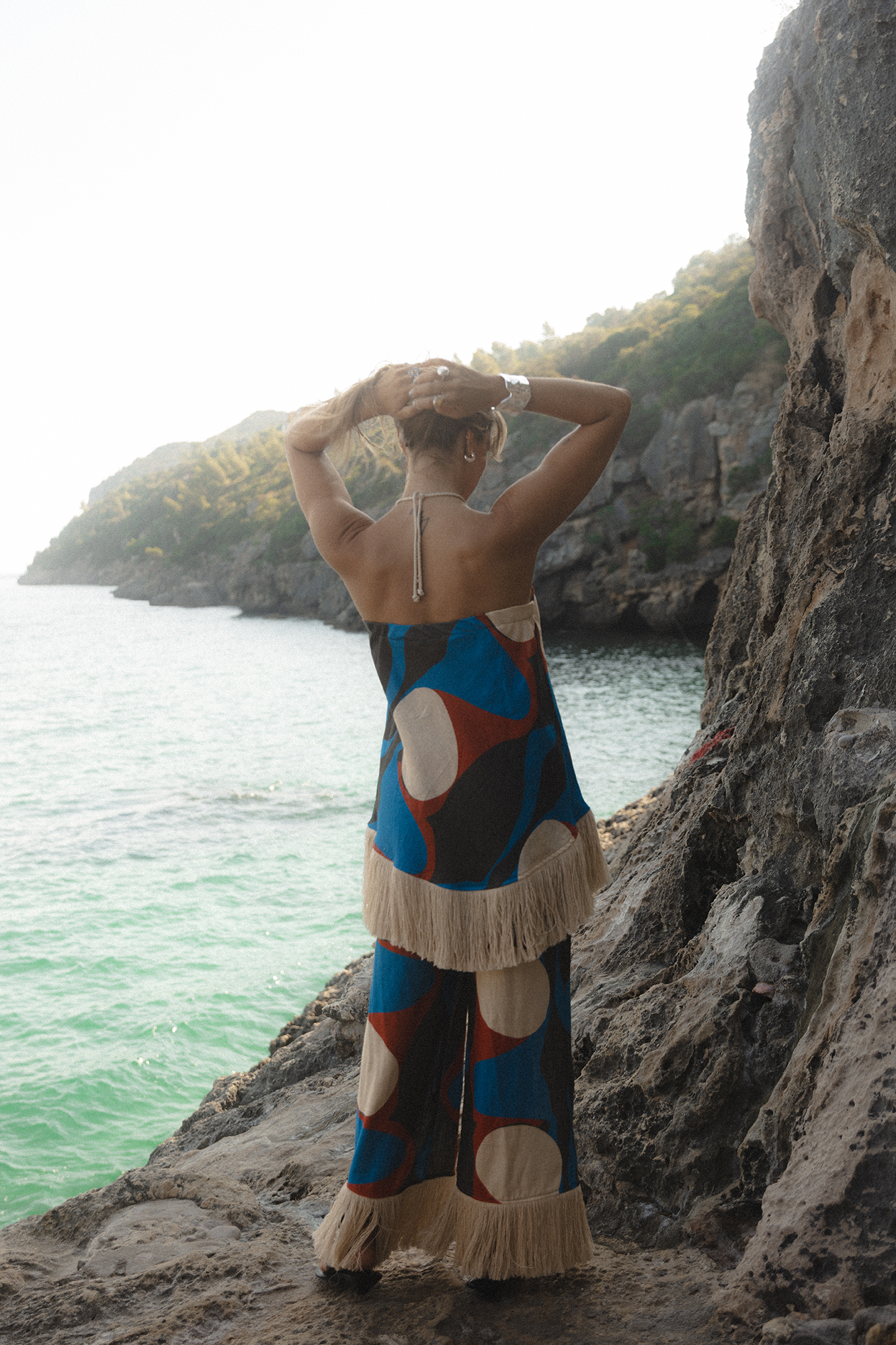 Com atilhos no pescoço, silhueta "A" e franjas na bainha, a nossa forma favorita de o usar são com as calças FIONA do conjunto.