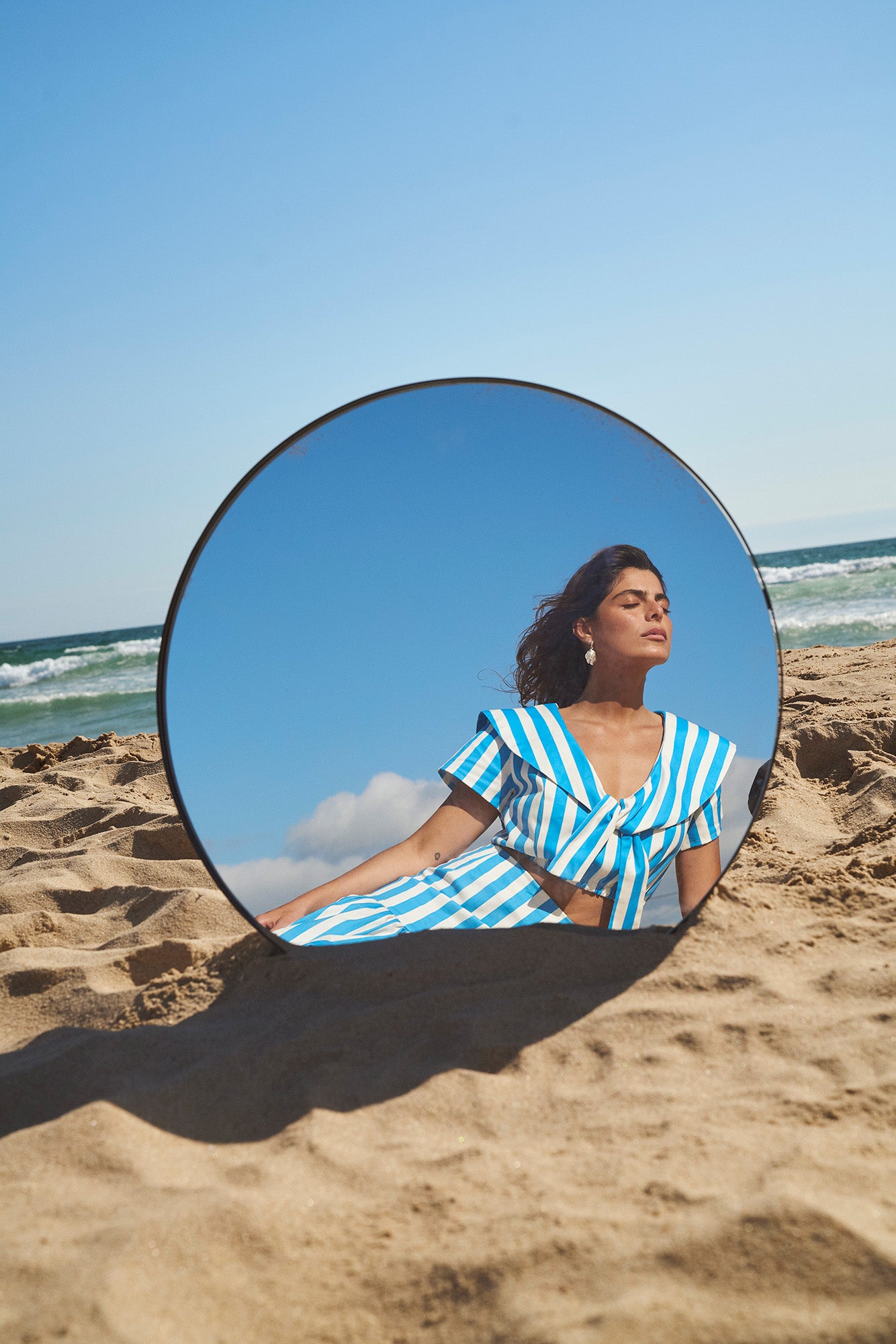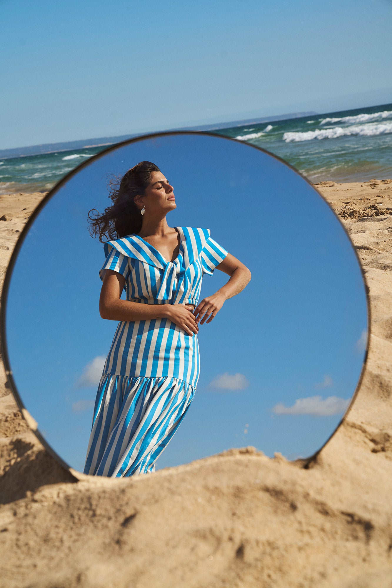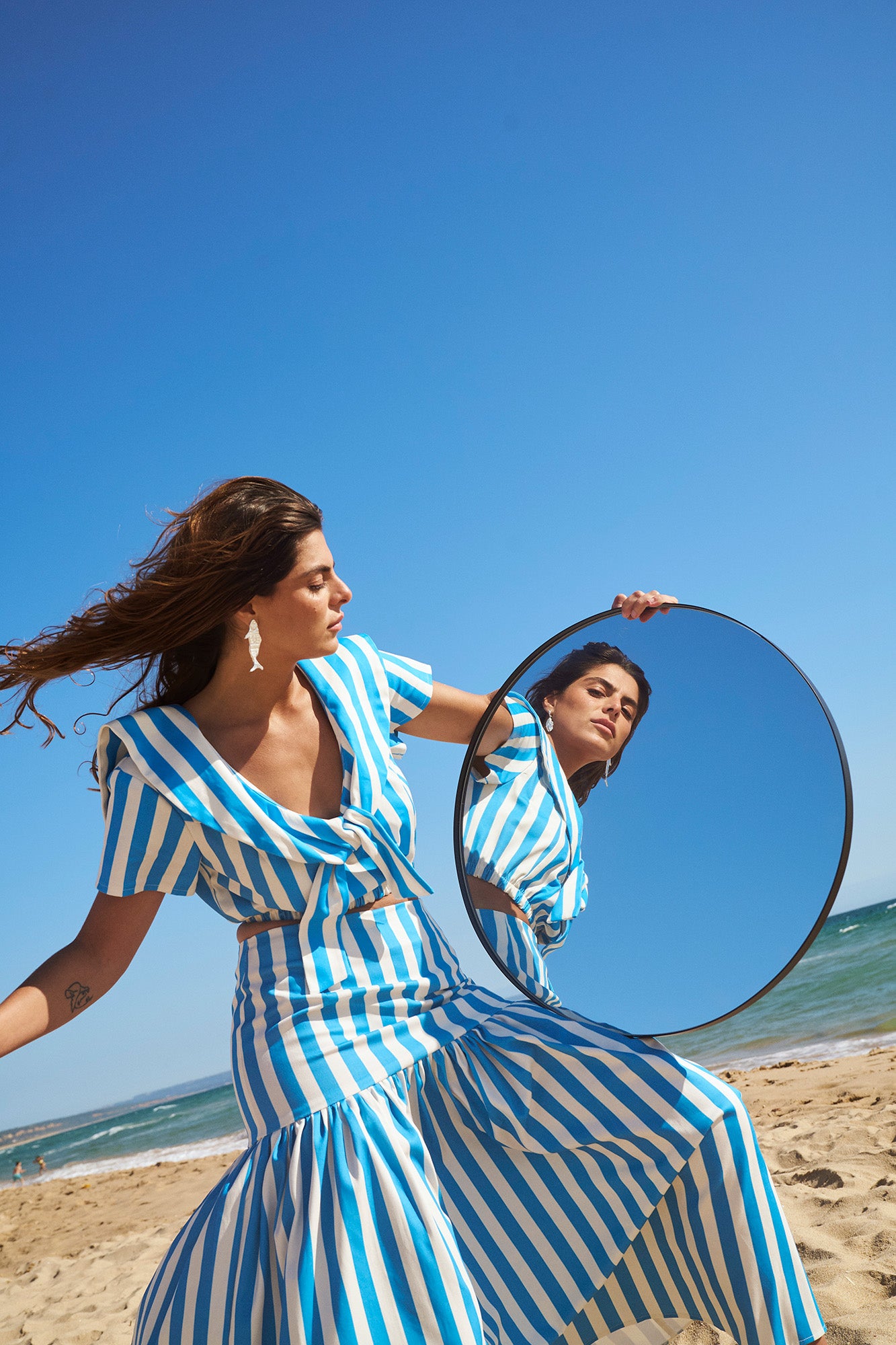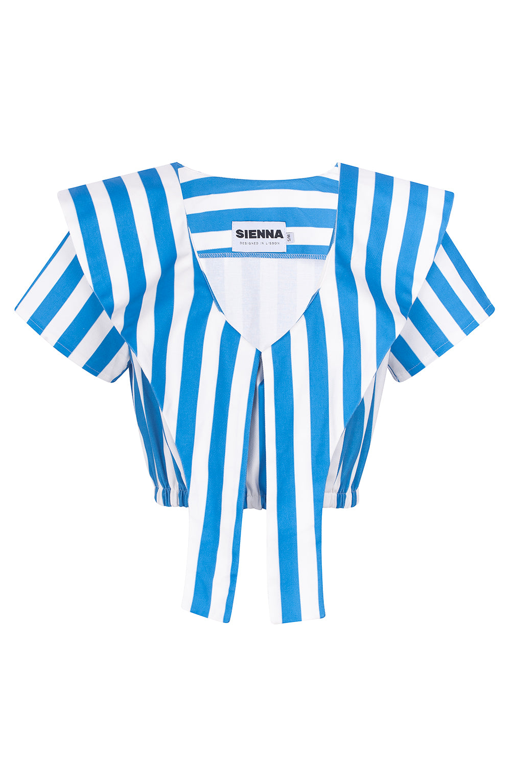 Inspirado nas camisas dos antigos marinheiros, com gola e elástico na cintura, este crop top divertido será perfeito para os dias mais quentes do seu Verão. Combine-o com a saia OLGA para o look perfeito!
