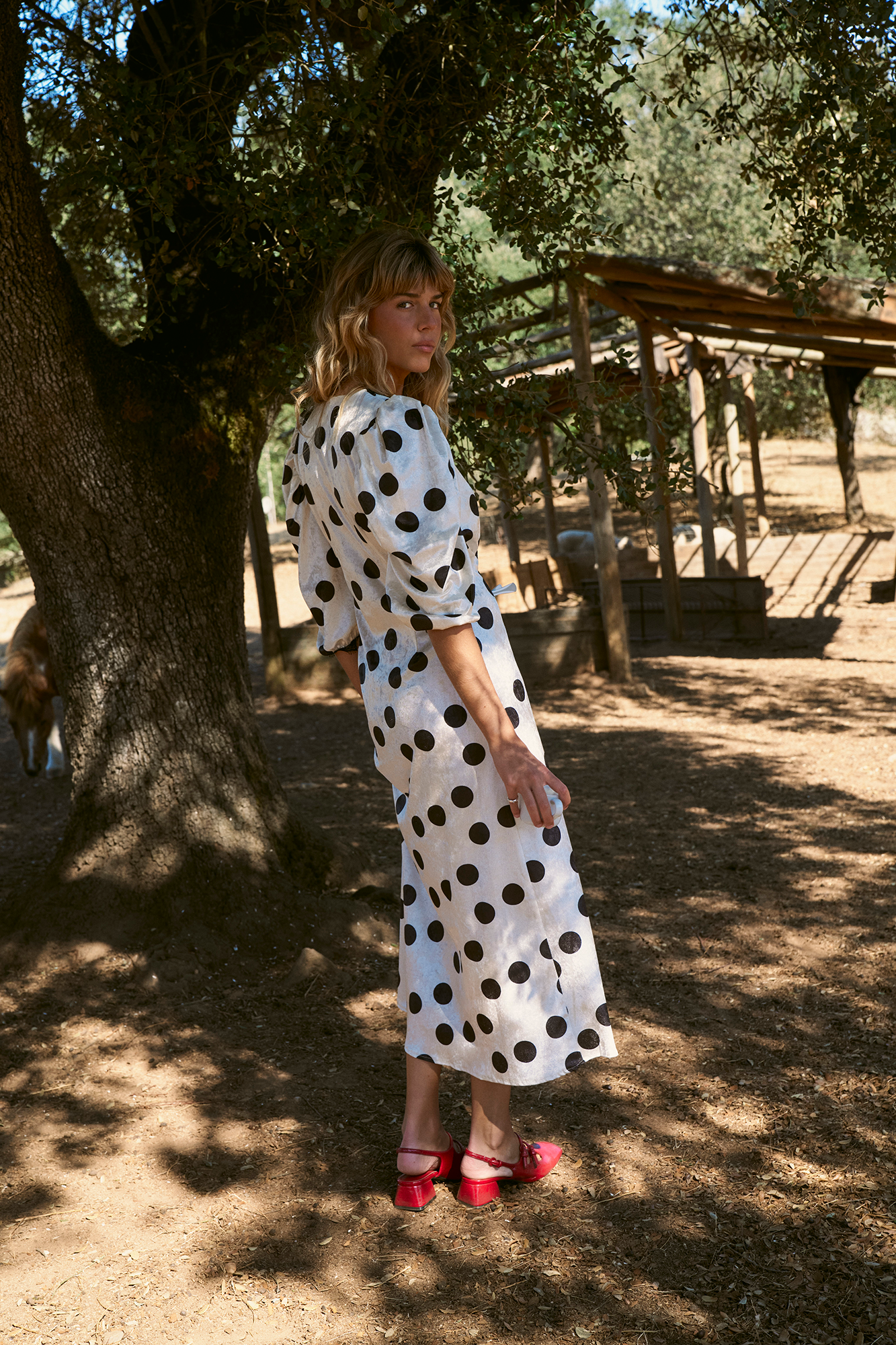 NATÁLIA is a statementa dress with presence, reinventing the classic polka dot with black lace and light velvet, giving it a feminine and bold touch.