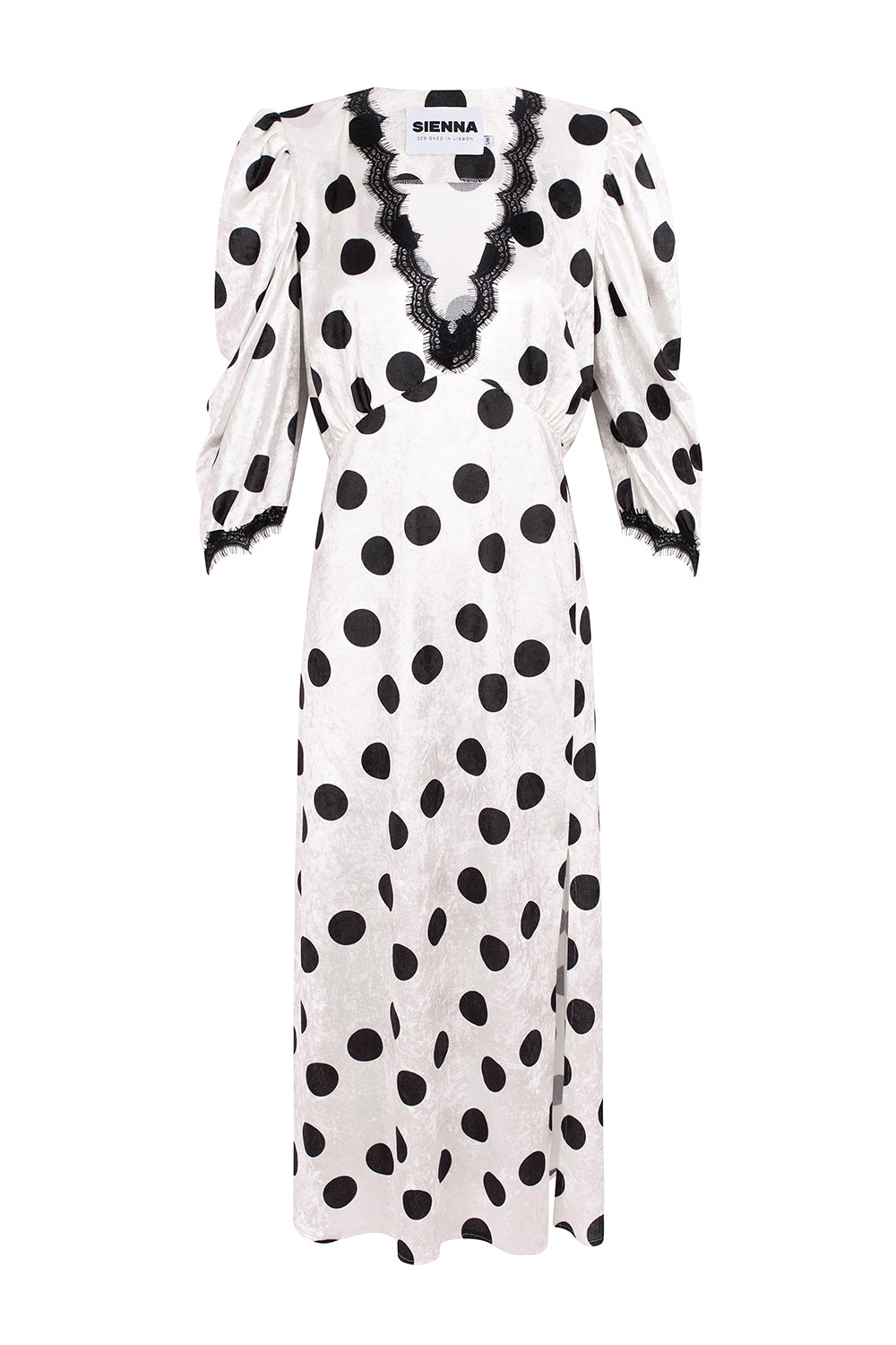 NATÁLIA é um vestido com presença, sendo o clássico polka dot reinventado com renda preta e veludo ligeiro, conferindo-lhe um toque feminino e ousado.