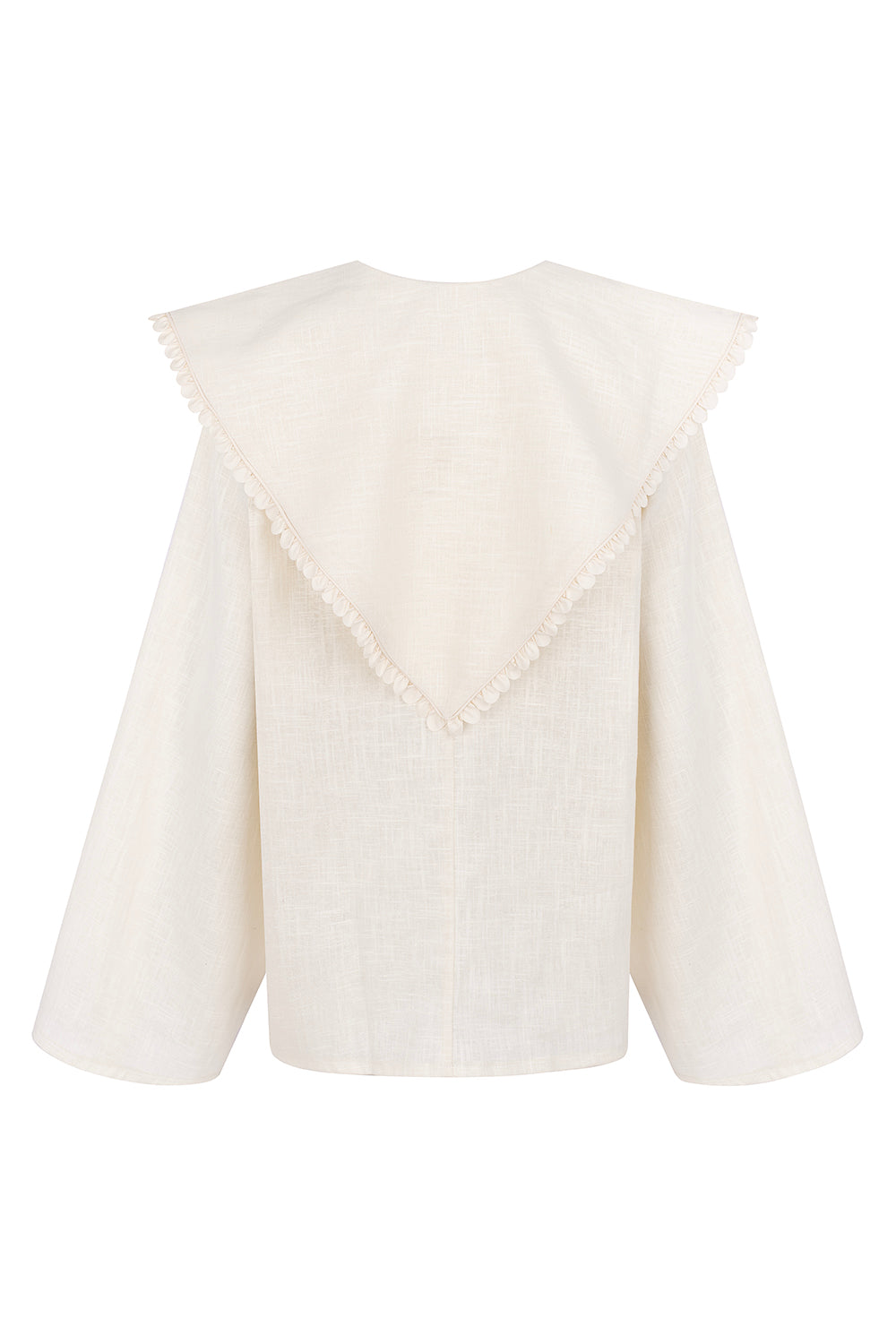 ODETE is an oversized shirt with bell sleeves and a collar inspired by the scarves worn by country women. It can be worn loose or knotted in the front.