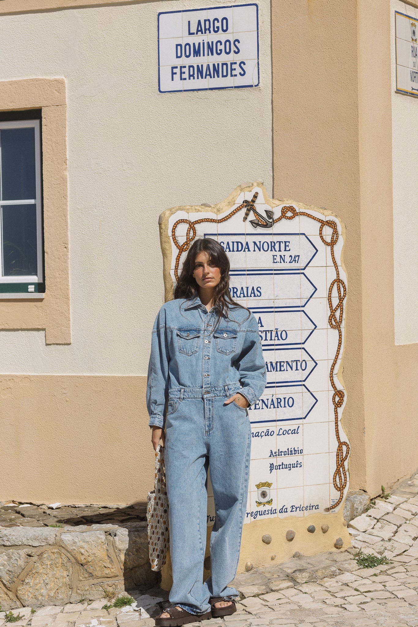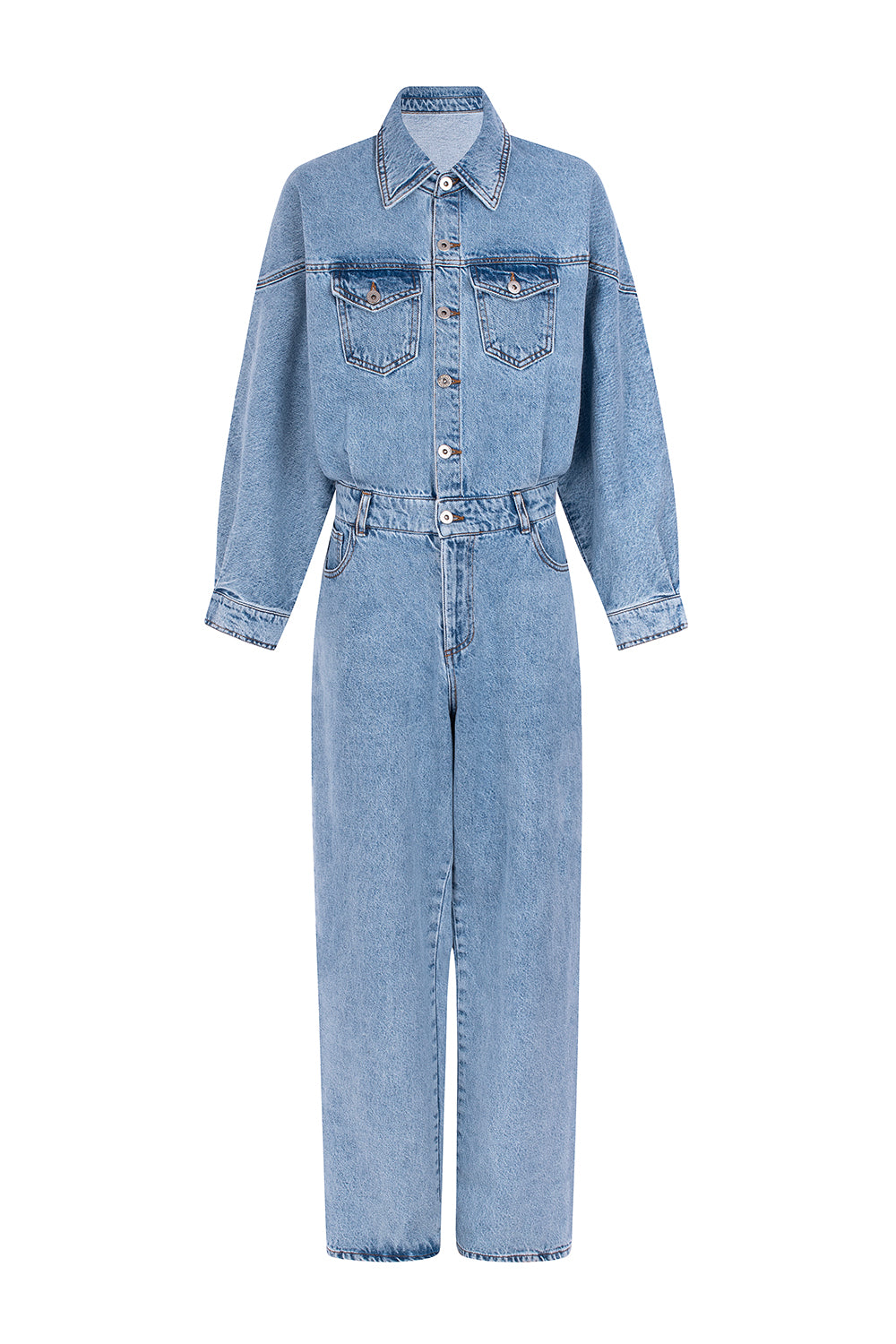 Made from super comfortable 100% organic cotton denim in a light blue shade, this jumpsuit features long bat sleeves, a stylish collar, and Sienna engraved buttons. It also has a metal zipper, side and back pockets, and straight fit legs.