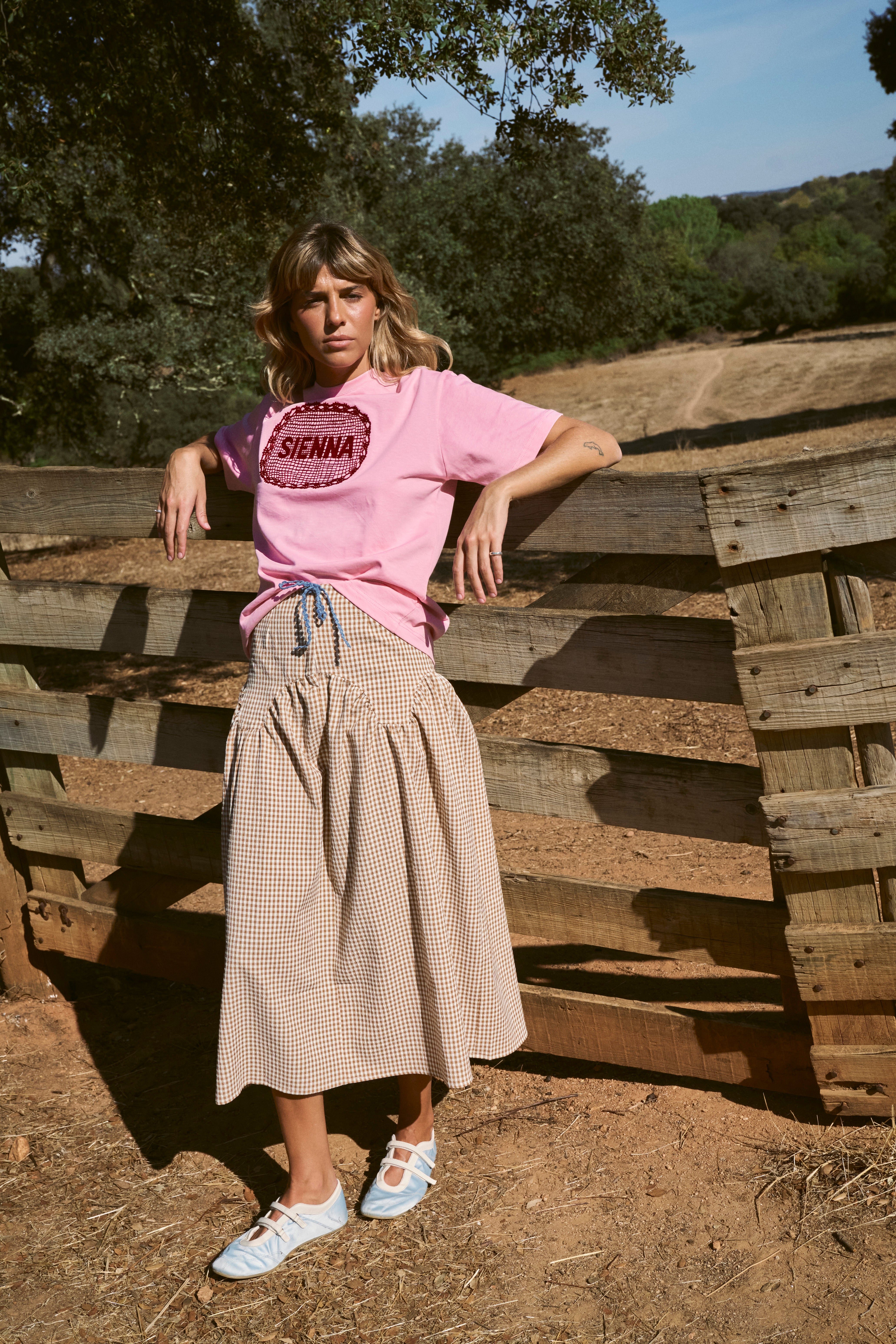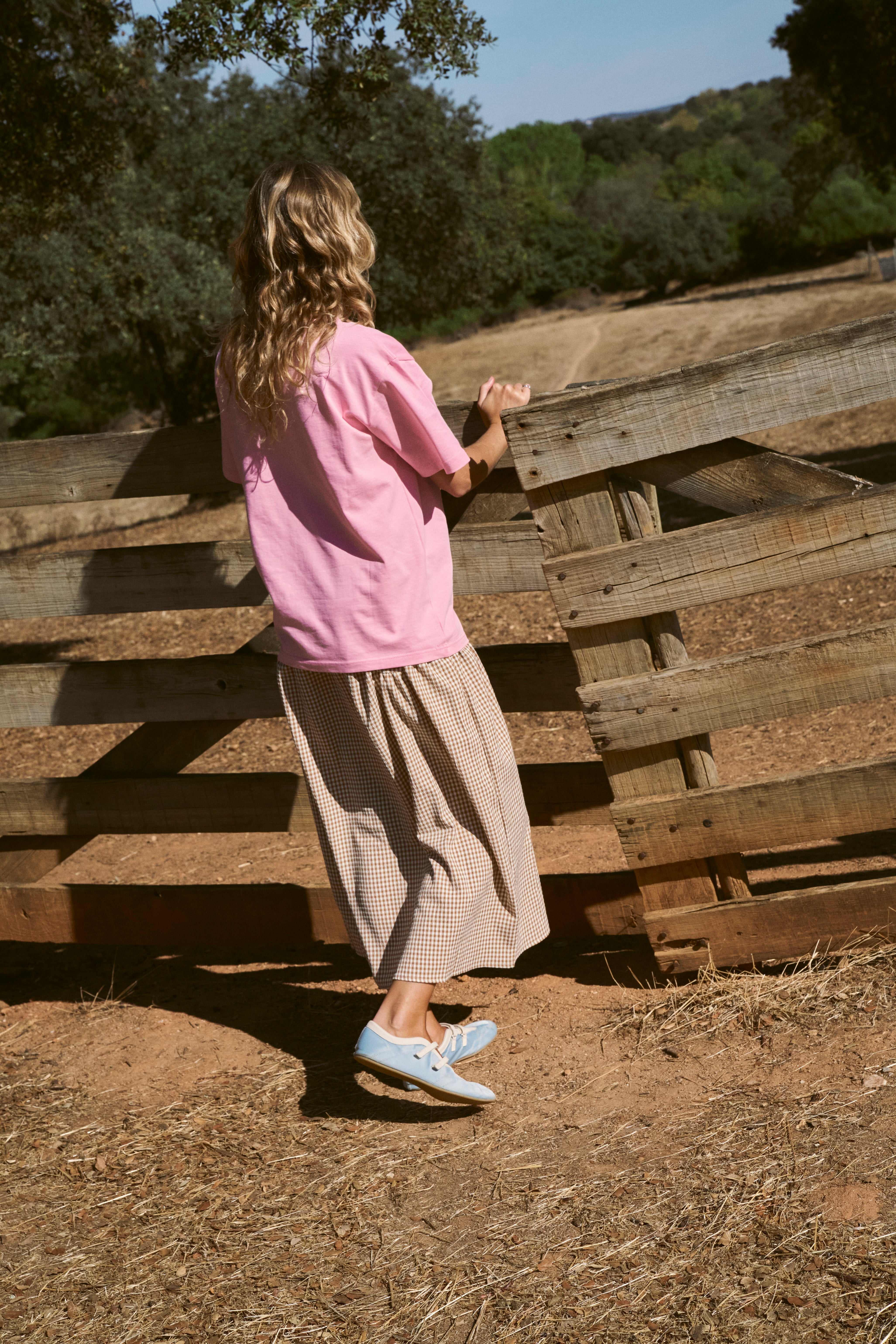 Feminina e fluída, esta saia fica bem com t-shirts oversized ou até mesmo camisas.