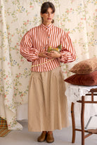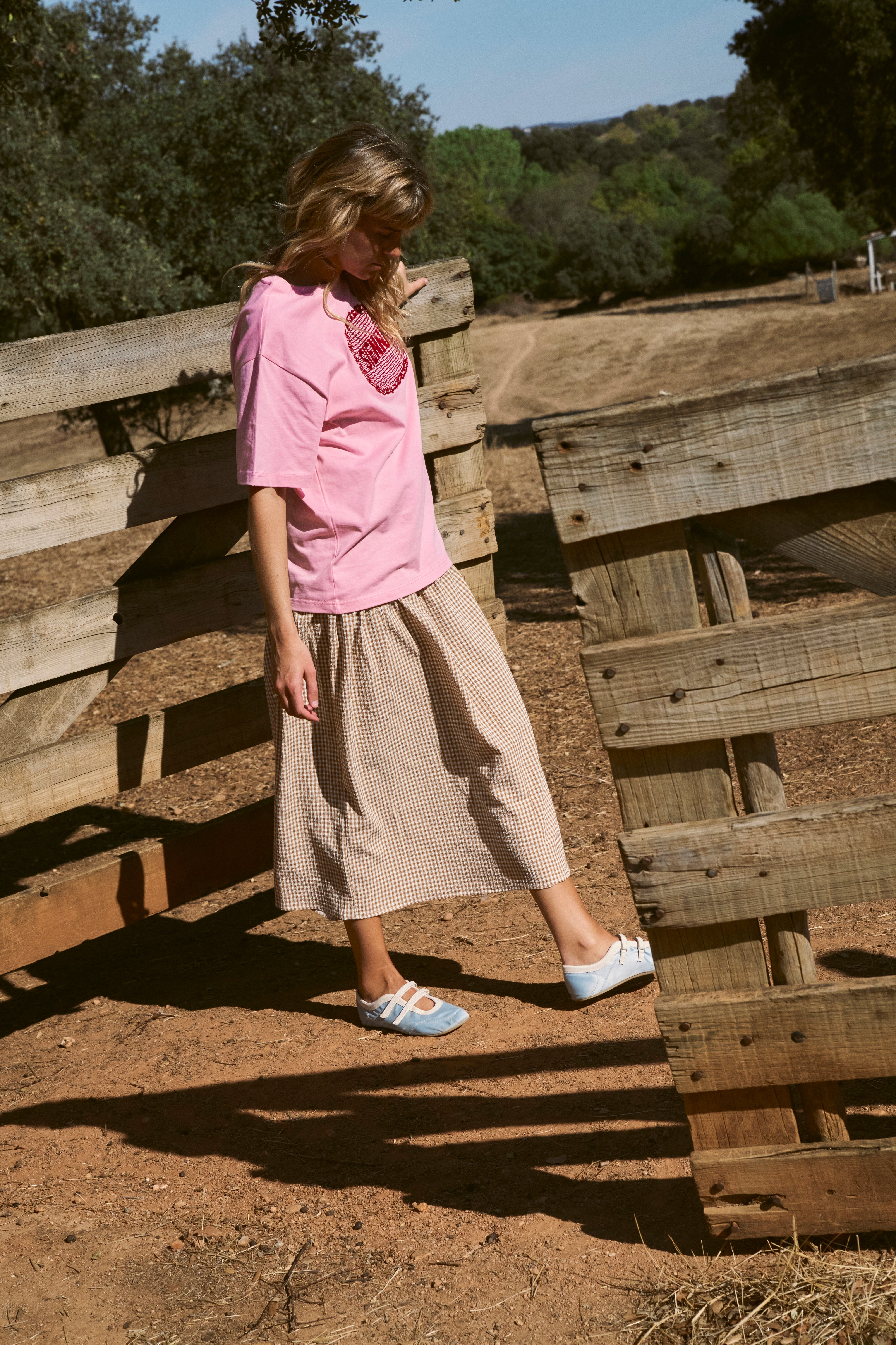 Feminine and flowy, this skirt pairs well with oversized t-shirts or even shirts.