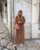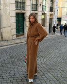 O jumpsuit RABBIT é uma das nossas peças favoritas da coleção. Em bombazina castanho com gola alta, fecho frontal na carcela, perna a direito e bolsos chapados, este jumpsuit é perfeito para os dias mais frios de Inverno.