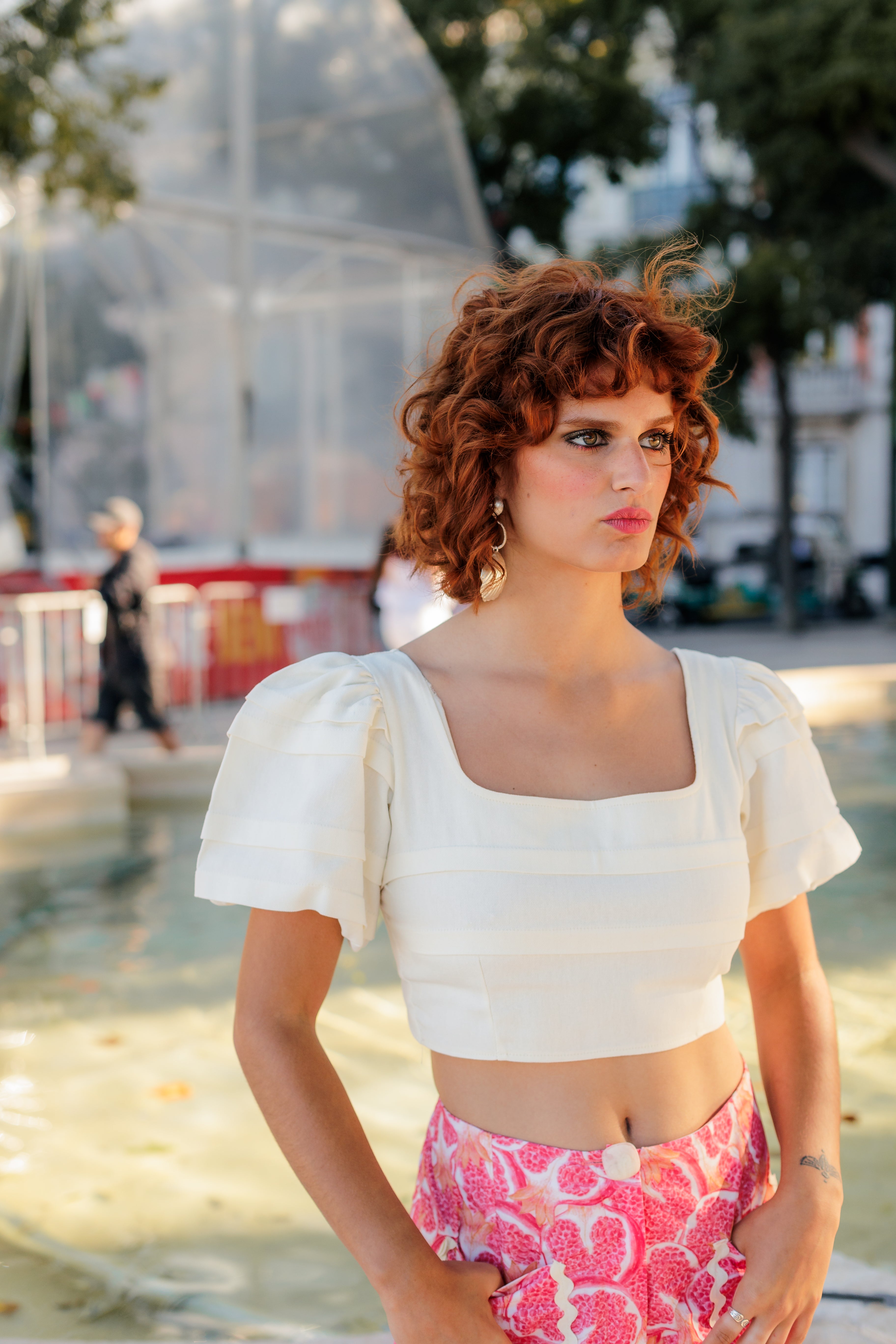 O nosso bestseller Frida está de volta! Como nós adoramos as suas mangas ballon e o seu laço romântico nas costas. Feito em algodão, este top super versátil e feminino pode ser conjugado com saia, calças ou calções, dependendo da ocasião.
