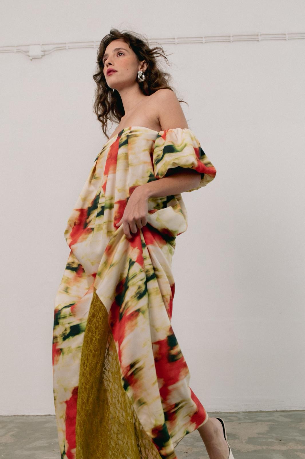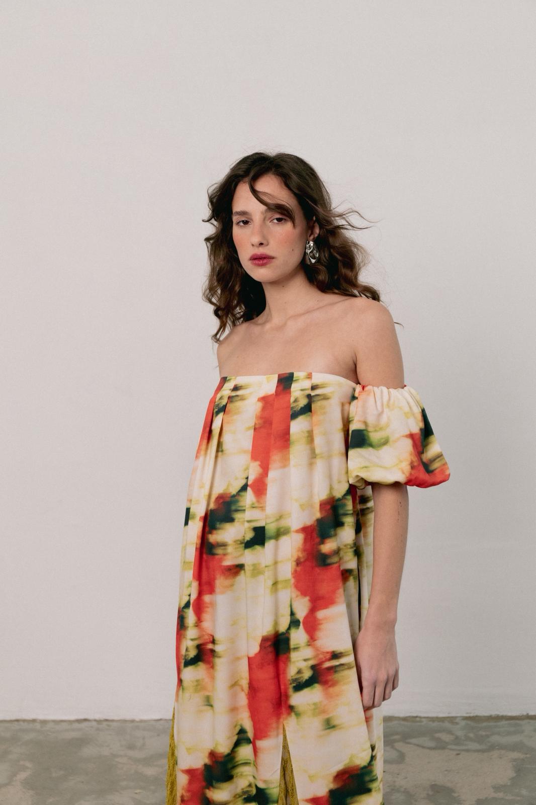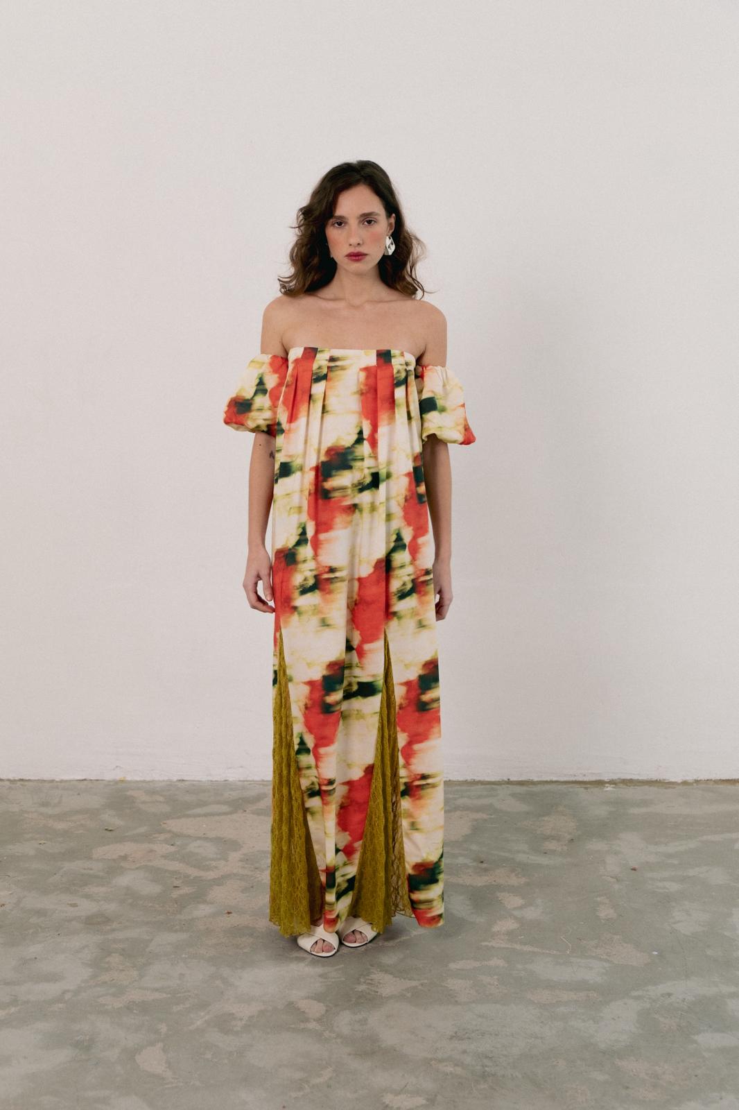 Bellis is a long, light, and relaxed dress. The neckline features front pleats and an elasticated back, making it loose and comfortable. It also has two front slits with lace appliqué. The short, puffed sleeves add volume and a romantic touch, balancing the fluidity of the skirt.