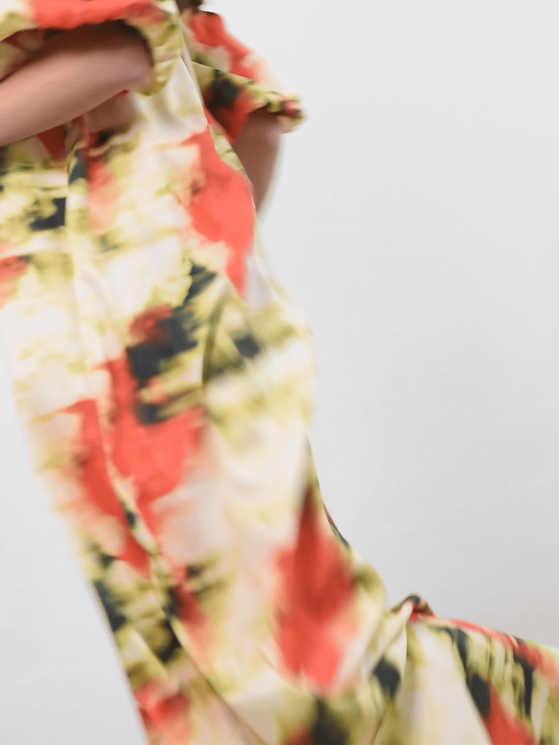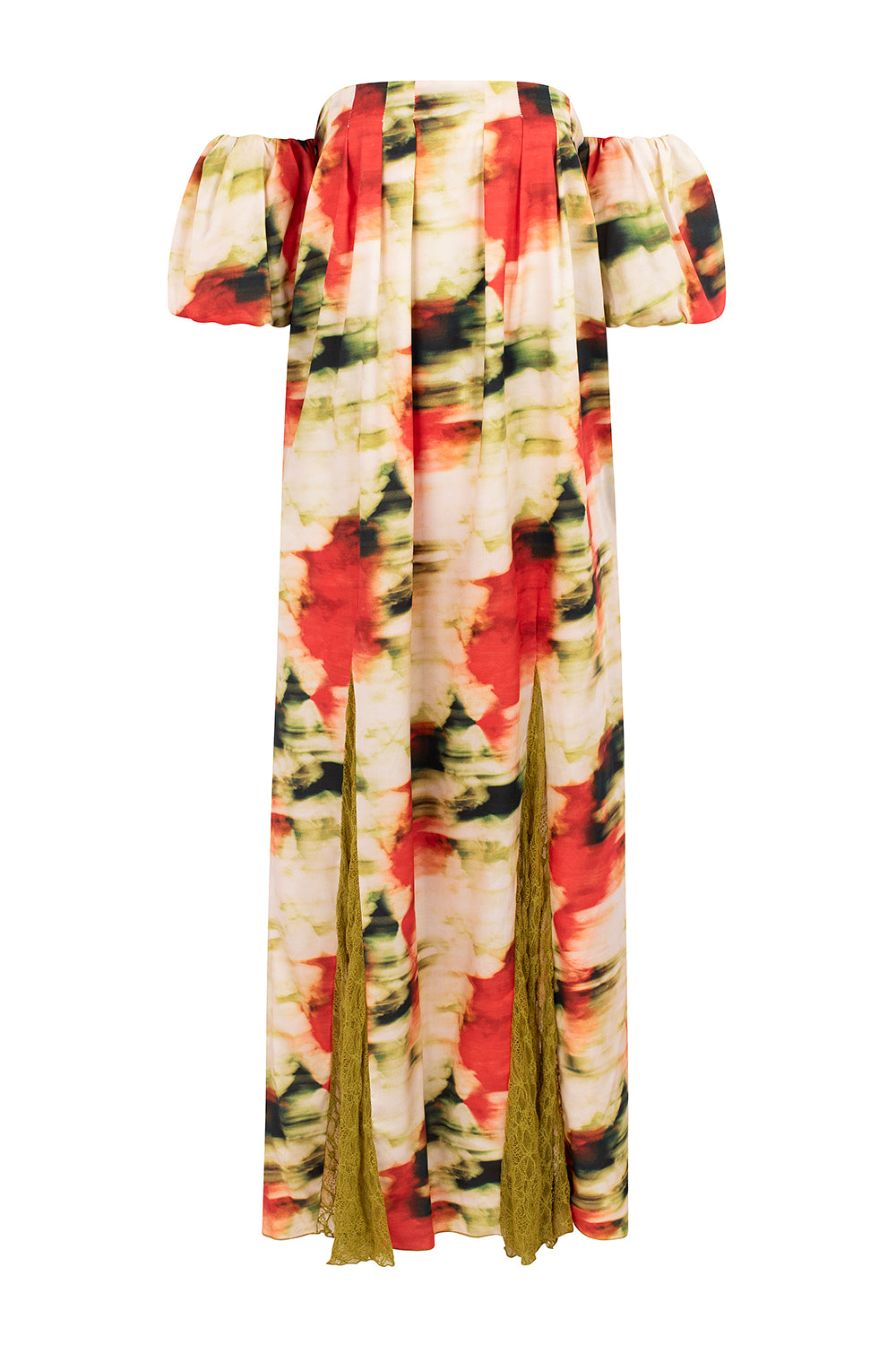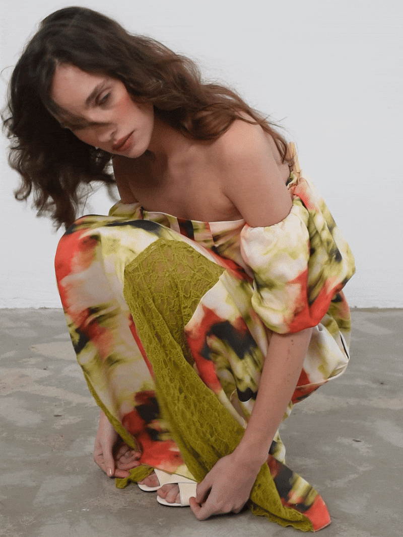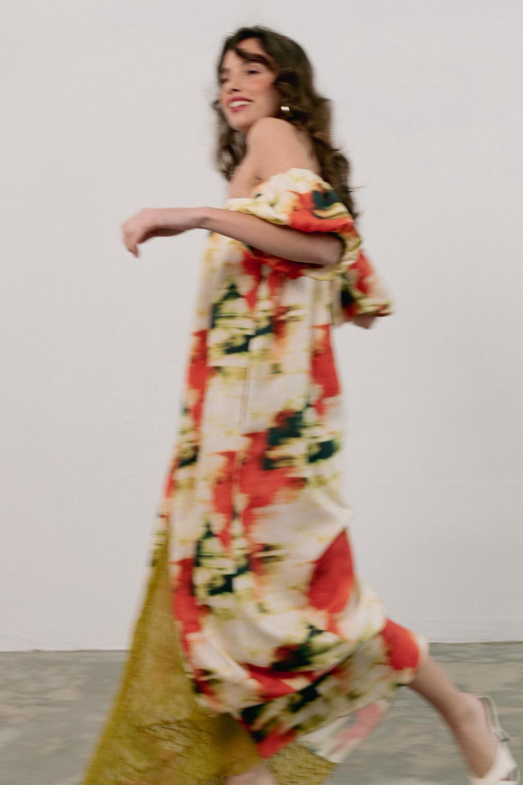 Bellis is a long, light, and relaxed dress. The neckline features front pleats and an elasticated back, making it loose and comfortable. It also has two front slits with lace appliqué. The short, puffed sleeves add volume and a romantic touch, balancing the fluidity of the skirt.