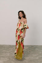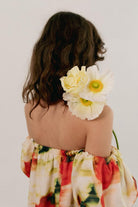 O Bellis é um vestido longo, leve e descontraído. O decote apresenta pregas frontais e um elástico nas costas tornando-o solto e confortável. Tem ainda duas rachas frontais com aplicação de renda. As mangas curtas bufantes acrescentam volume e um toque romântico equilibrando a fluidez da saia.