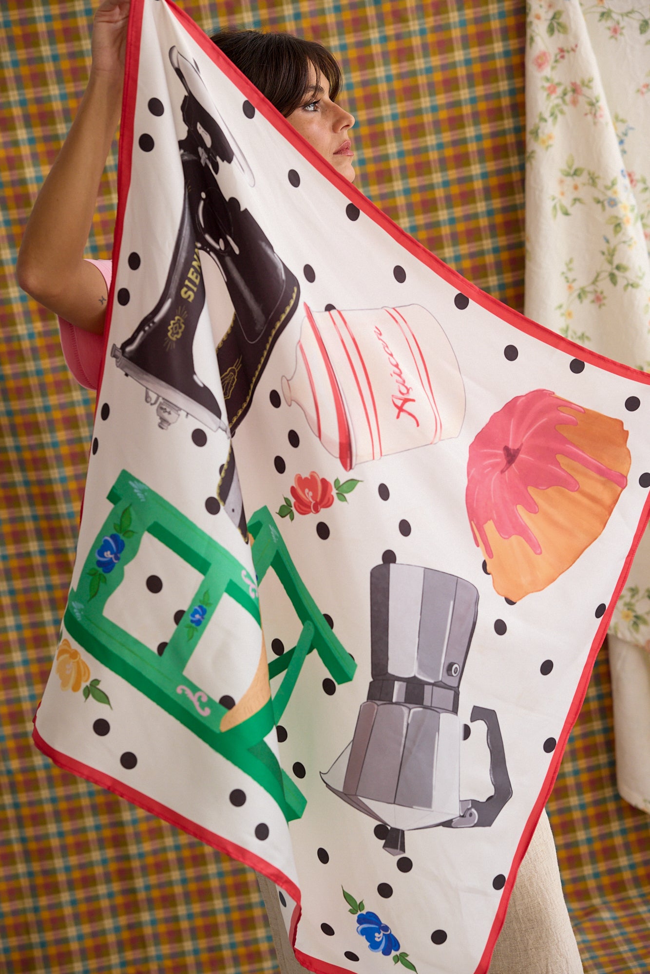 Do bolo quentinho à máquina de costura, do pote de açúcar à cadeira alentejana e cafeteira de lume. Juntando ao padrão polka dot atemporal e tons de vermelho que unem todos os elementos, esta é uma peça que traz memórias, calor e estilo ao seu dia a dia.