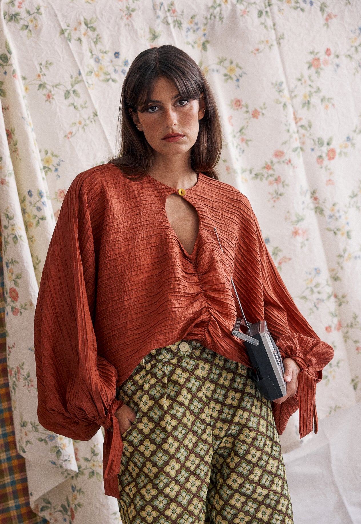 HELENA is a batwing-sleeved shirt with a front slit, a button detail on the neck, and bow cuffs.