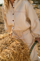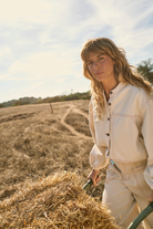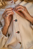 This short, voluminous bomber jacket, with pockets and floral appliqués, inspired by the doilies from grandmothers' houses, is the perfect blend of modernity and craftsmanship.