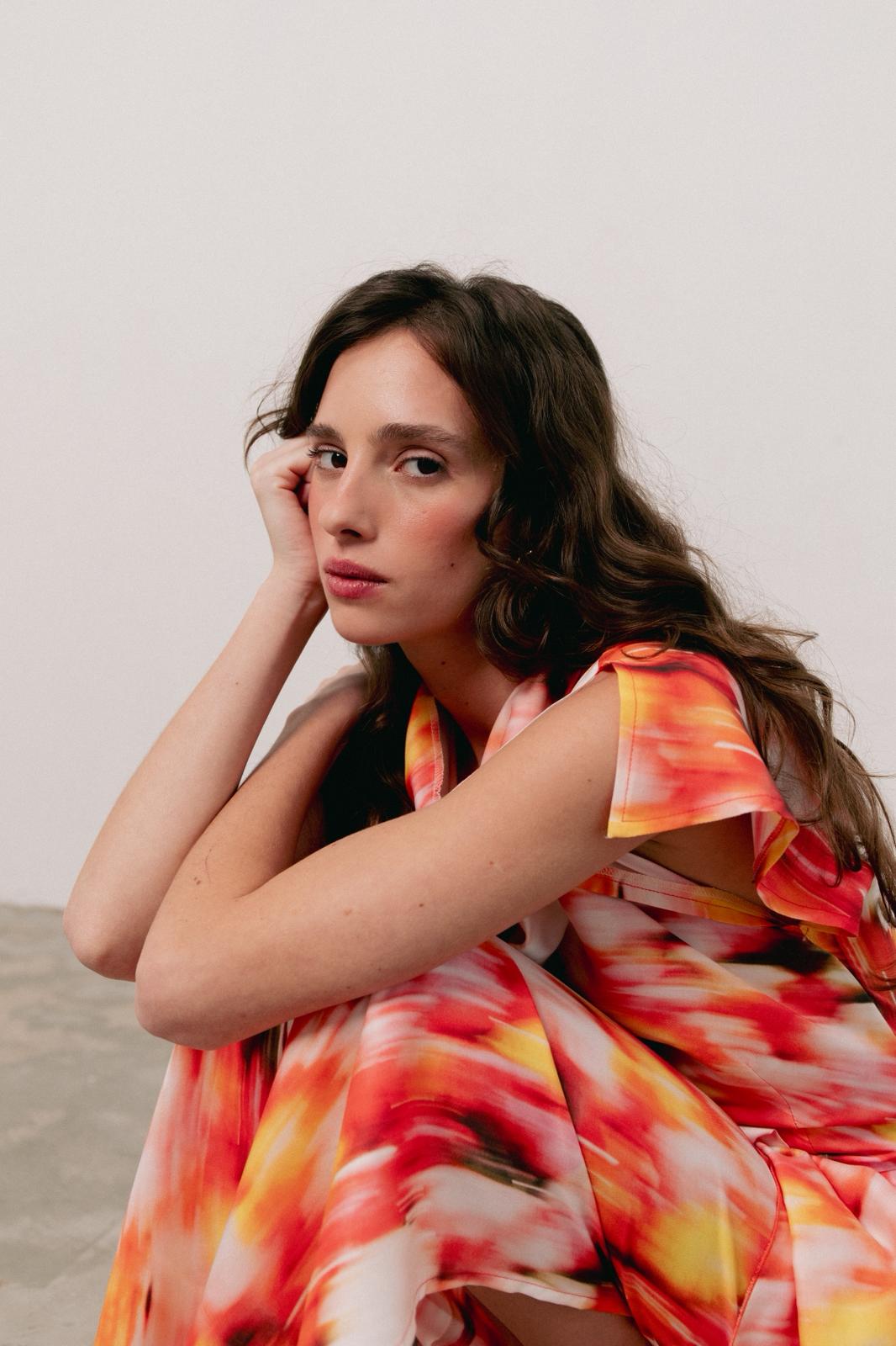 Dahlia is a long, flowing, and elegant dress. The neckline, with its movement and lightness, creates a feminine and elegant silhouette.
