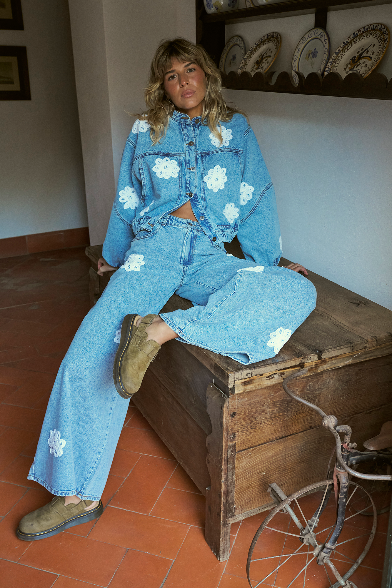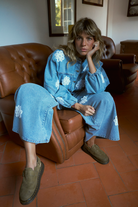 Eleve o seu estilo com as nossas icónicas calças MAYRA, agora em denim azul claro com aplicações de flores que lembram os naprons das avós.