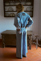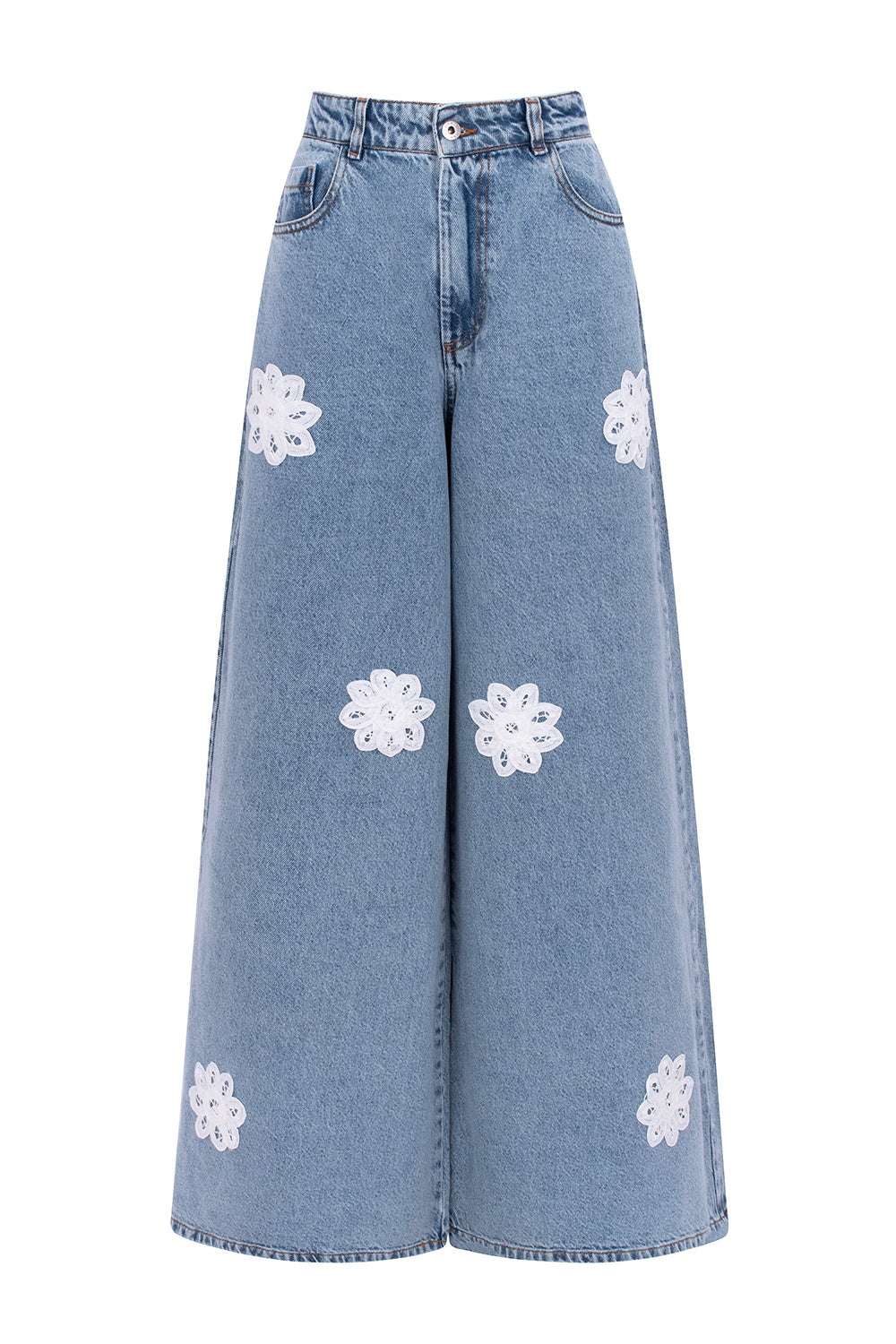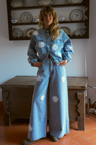 Elevate your style with our iconic MAYRA pants, now in light blue denim with floral appliqués reminiscent of your grandmother's doilies.