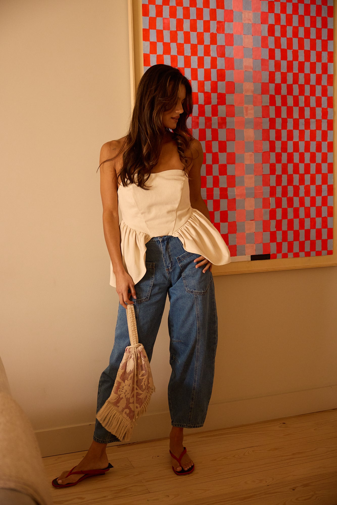 MOLLY é uma mala de mão em renda bordada de algodão, com uma alça, franjas e cordões para fechar.