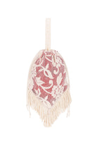 MOLLY is a handbag made of embroidered cotton lace, with a handle, fringe, and drawstring closure.