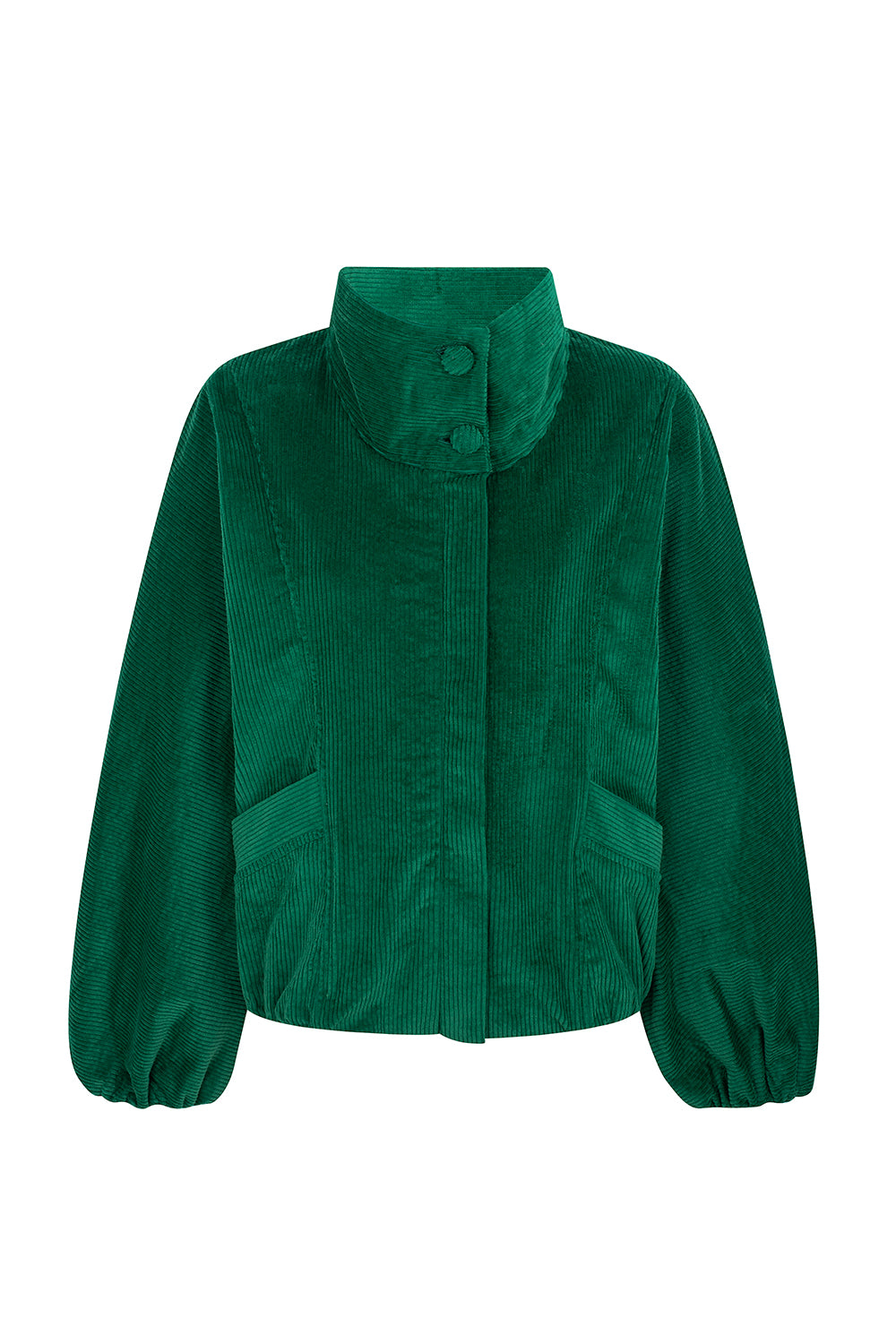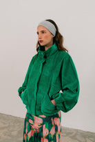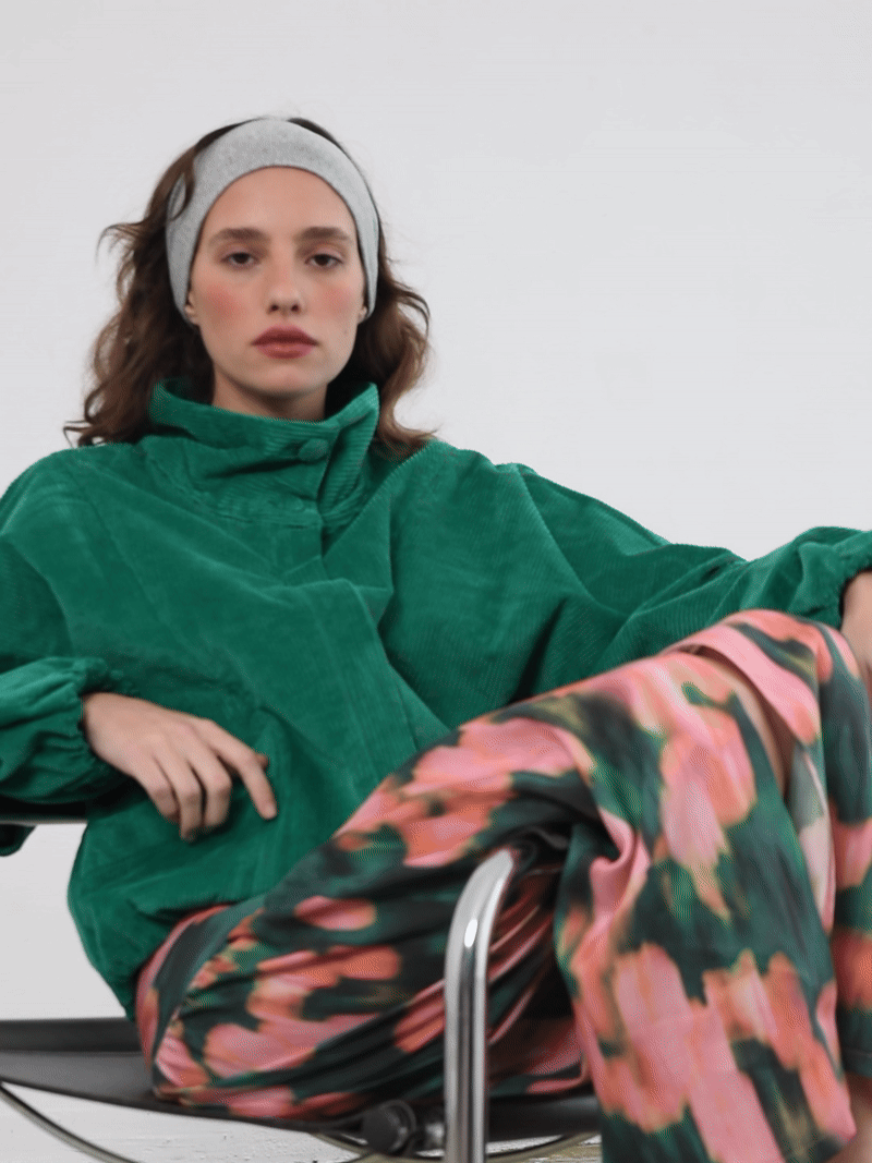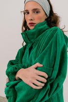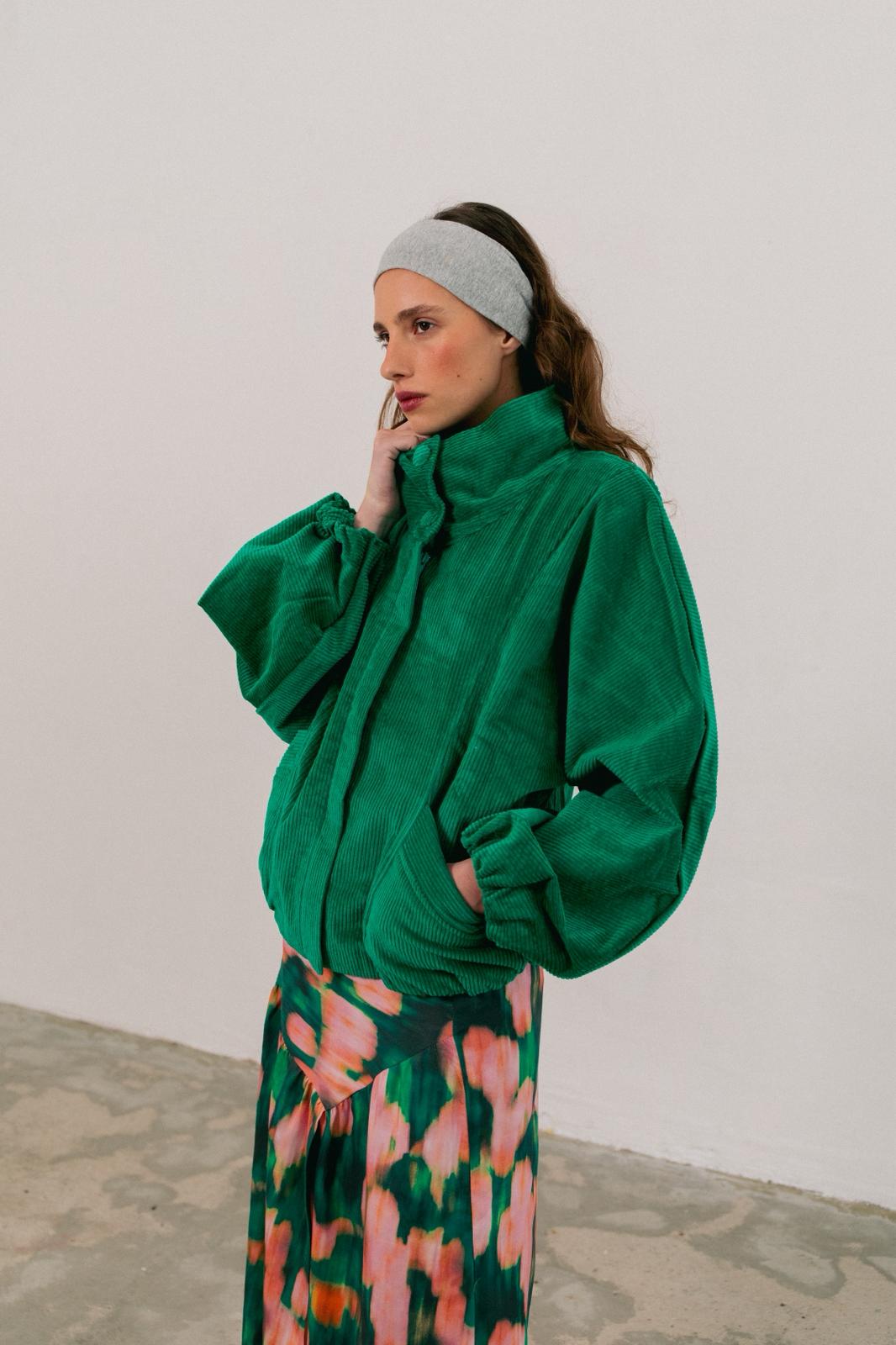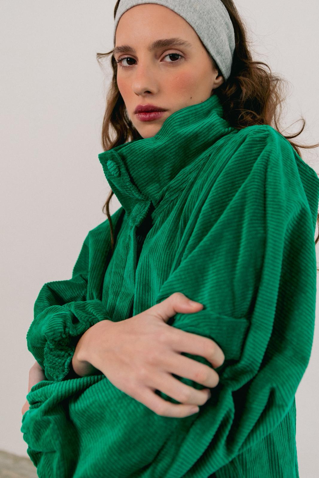 An oversized bomber with batwing sleeves and a high collar, crafted in corduroy that plays with texture and light. The front zipper and pockets make it practical yet effortlessly stylish. A warm, striking piece, perfect for chilly days with elegance and ease.