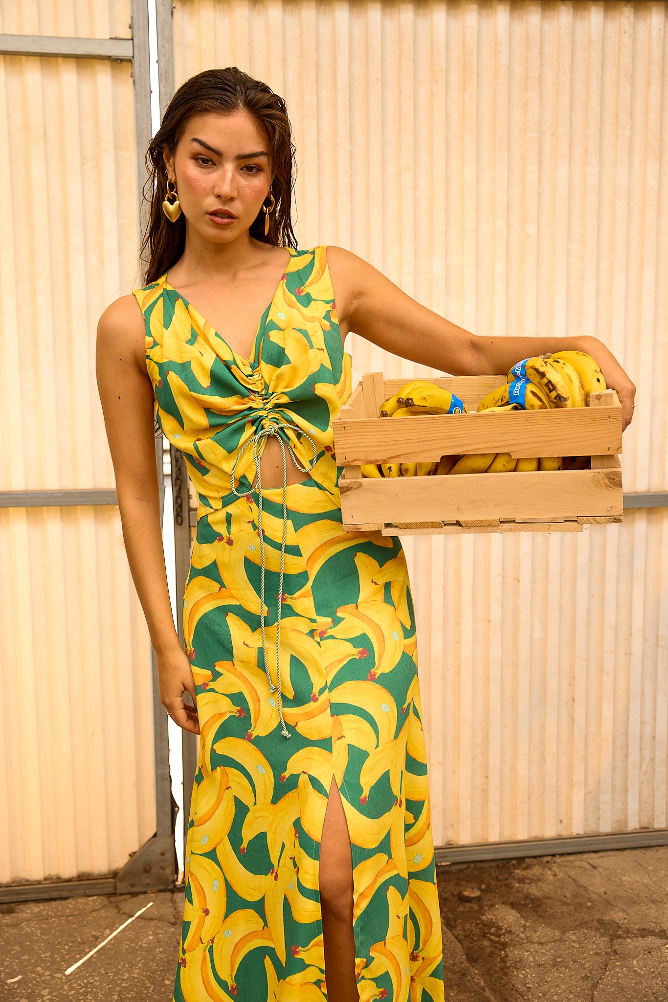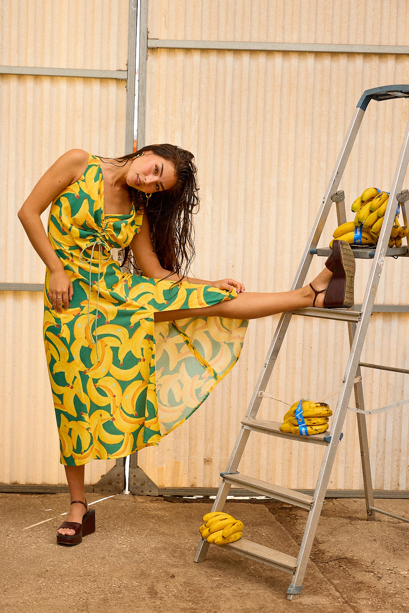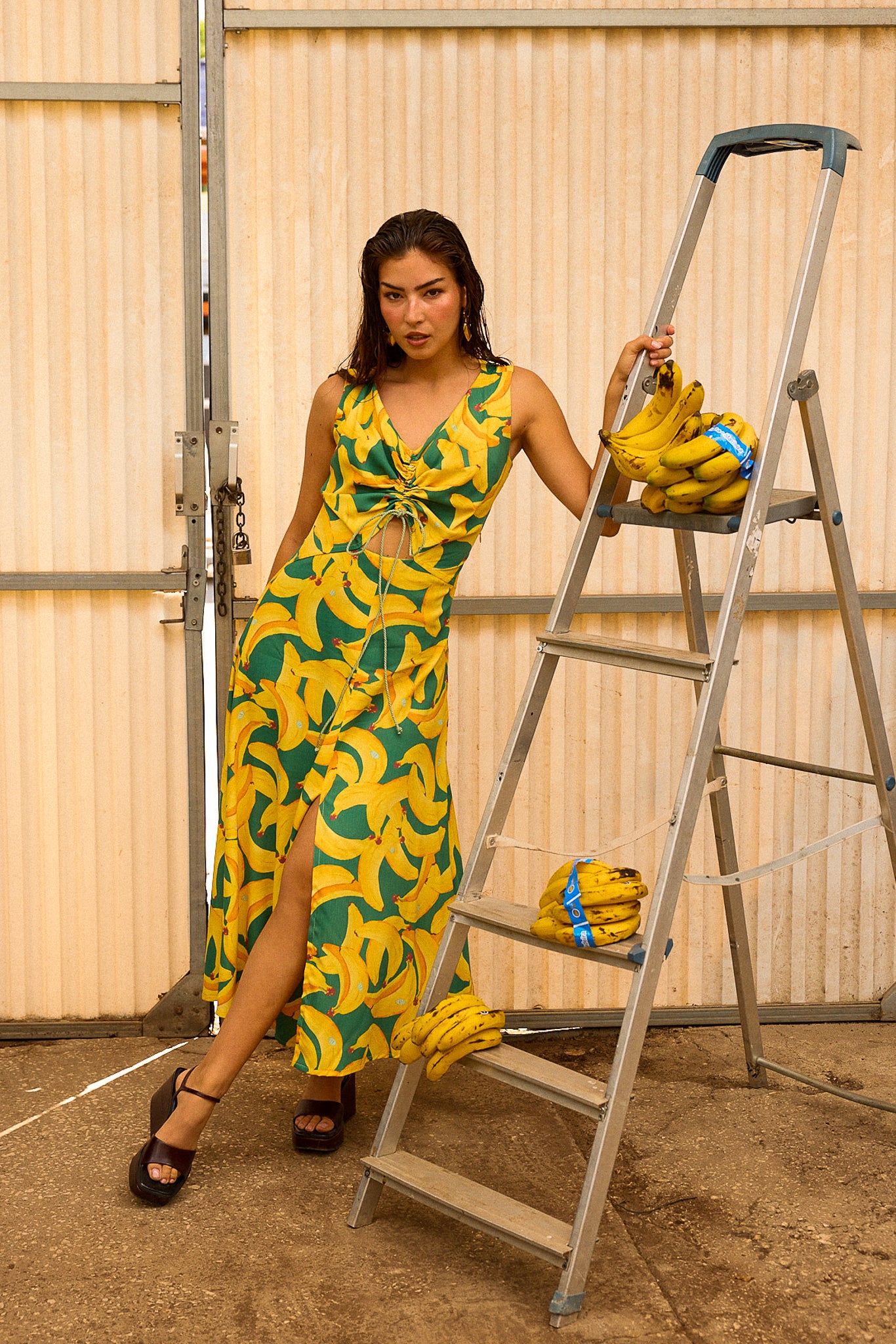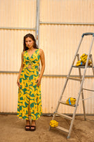 The unique pattern, inspired by the iconic banana fruit of Madeira Island, was thoughtfully designed by Sienna’s team, blending cultural homage with contemporary elegance. Perfect for warm days, this flowy dress combines effortless movement with distinctive charm.