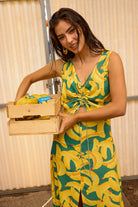 O padrão exclusivo, inspirado na icónica banana da Ilha da Madeira, foi cuidadosamente criado pela equipa Sienna, combinando a herança cultural da ilha com elegância contemporânea. Perfeito para dias quentes, este vestido fluido combina movimento natural com charme único.