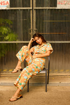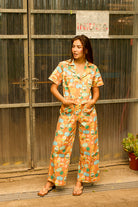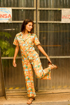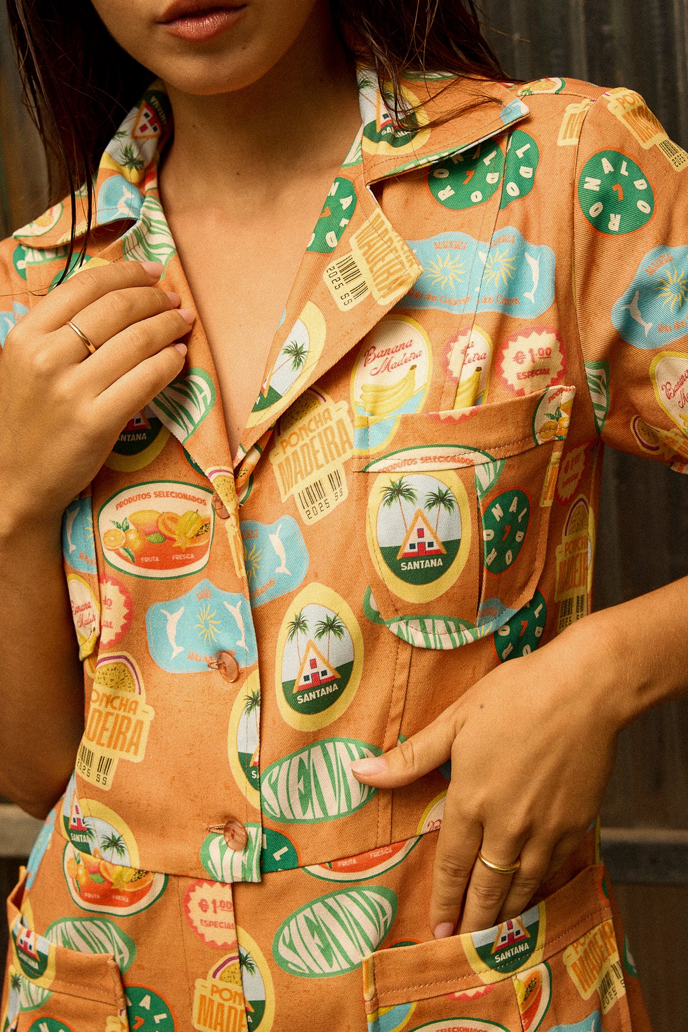 O padrão exclusivo apresenta símbolos icónicos da Ilha da Madeira, como o Cristiano Ronaldo, as bananas e a poncha, adicionando um toque de herança cultural a esta peça elegante. Perfeito para quem busca um jumpsuit distinto e com muita personalidade.