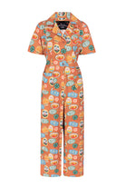 The unique pattern showcases iconic Madeira Island symbols like Cristiano Ronaldo, bananas and poncha, adding a playful cultural touch to this elegant piece. Perfect for those seeking a distinctive, expert-crafted jumpsuit with a lot of character.