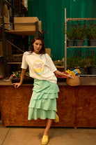 A saia LEAF em PALE GREEN foi inspirada na elegância natural das folhas de bananeira, dando-lhe uma silhueta fresca e divertida.