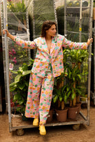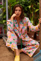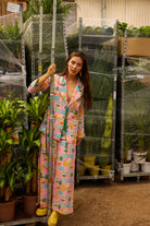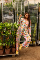 The unique pattern showcases iconic Madeira Island symbols like Cristiano Ronaldo, bananas and poncha, adding a playful cultural touch to this elegant piece. Perfect for those seeking a distinctive, expert-crafted jumpsuit with a lot of character.