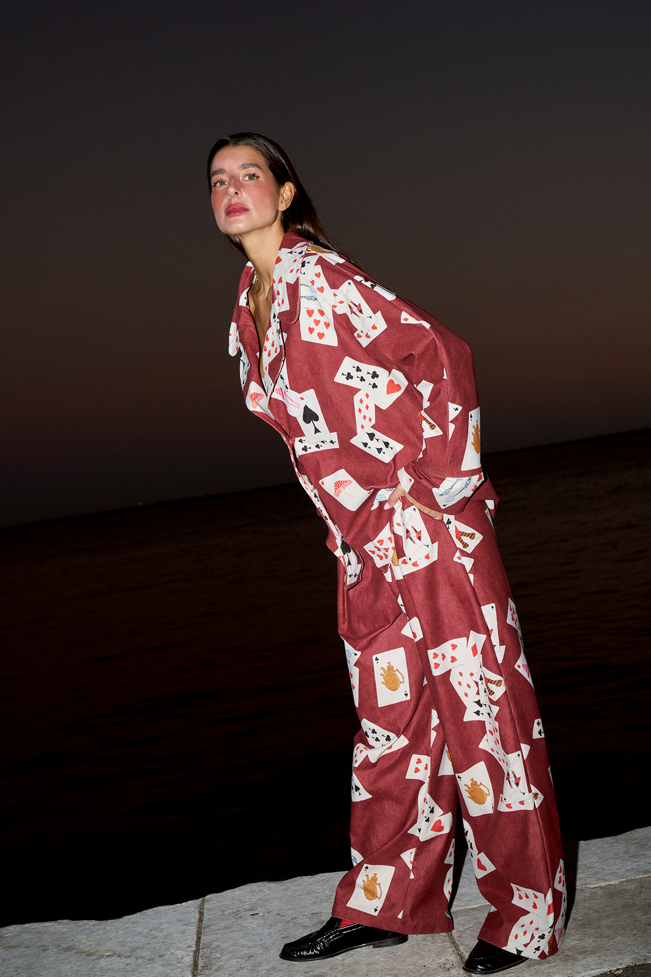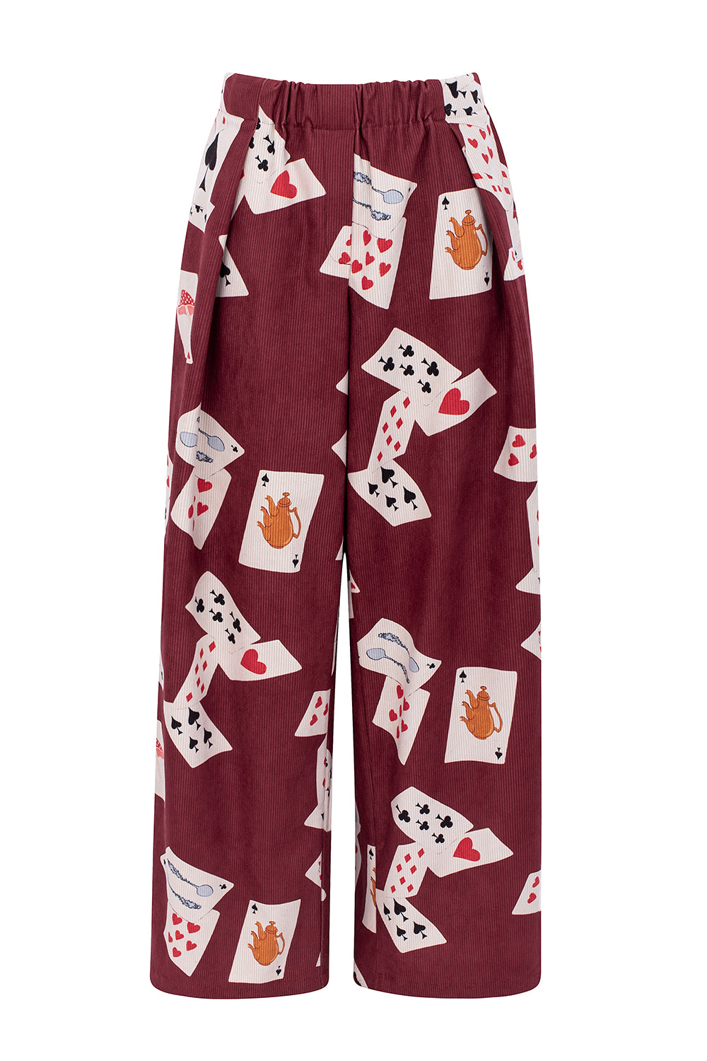 The ALICE trousers are a practical and comfortable style, and these are particularly special because they feature a pattern developed by the Sienna team inspired by the Queen of Hearts' guards, the Cards.
